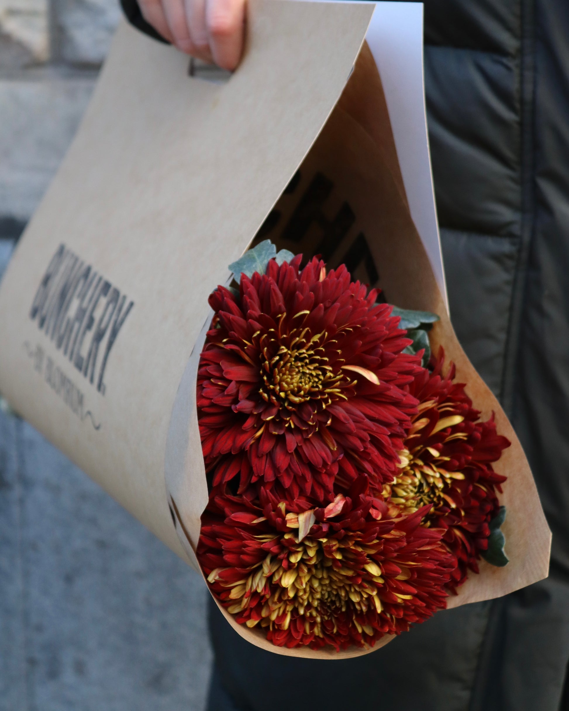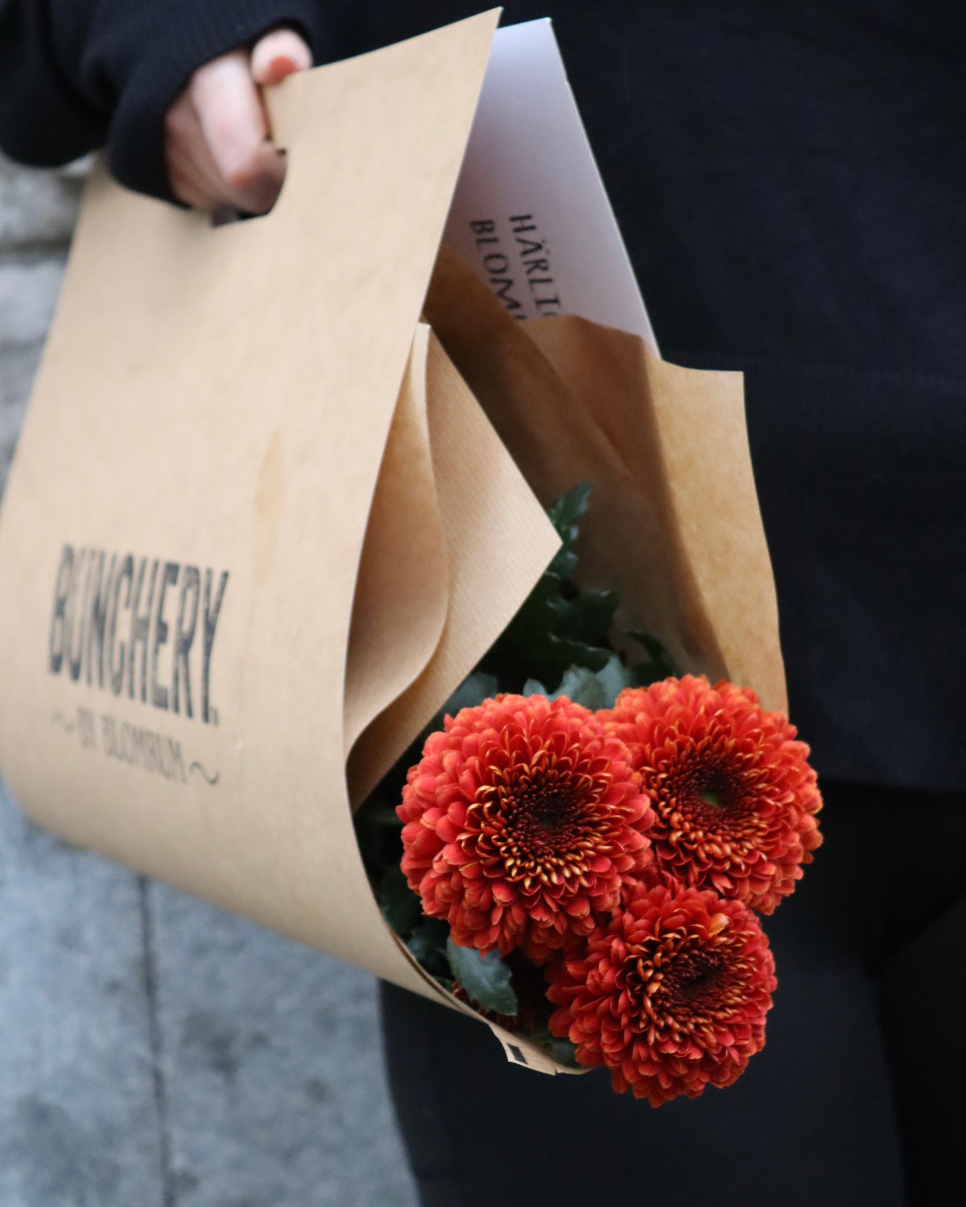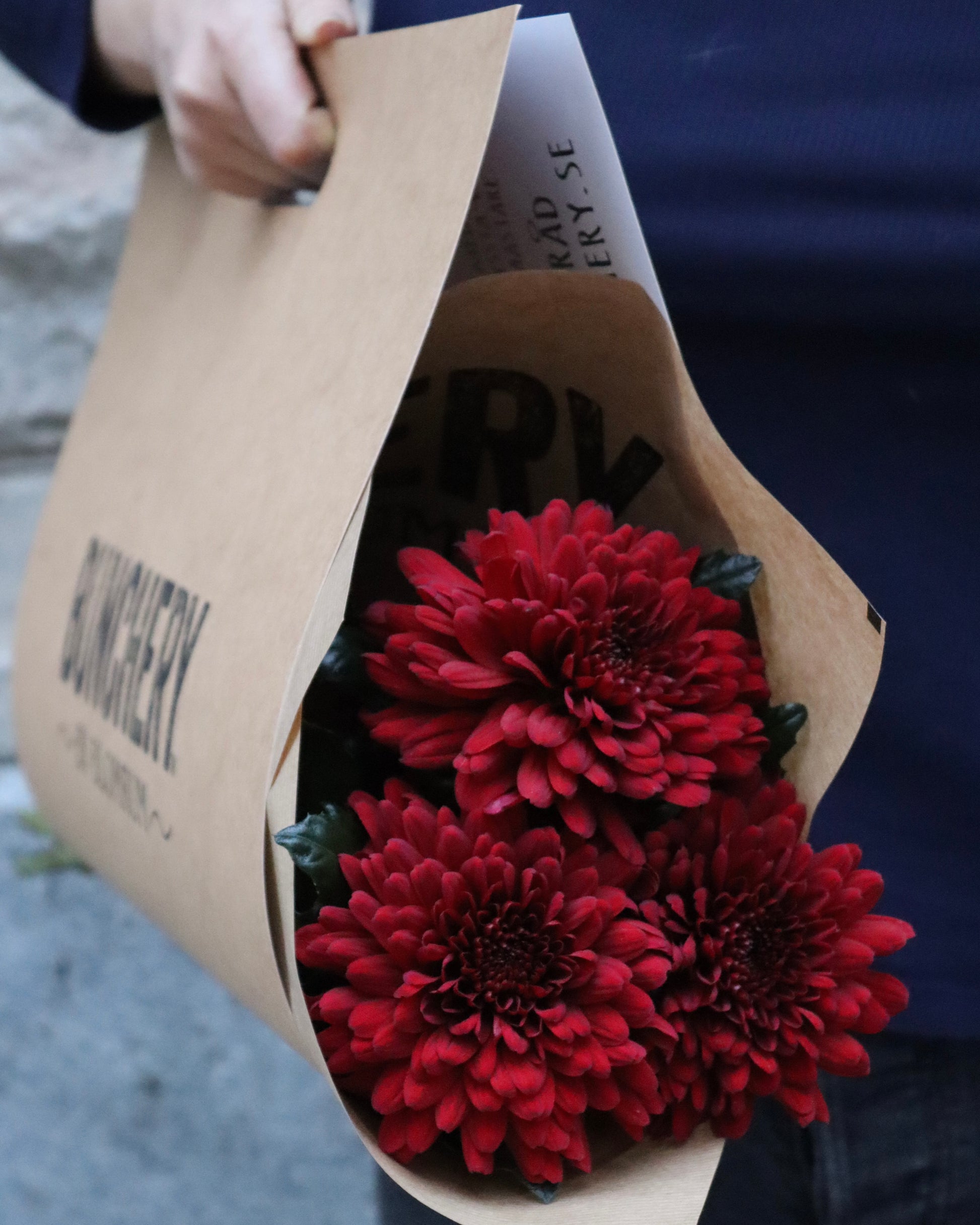 Bollkrysantemum är en hållbar och ståtlig blomma som passar fint med många andra blommor i ditt arrangemang. Välj en bunt eucalyptus att matcha med så har du ett fint och hållbart arrangemang i din vas.