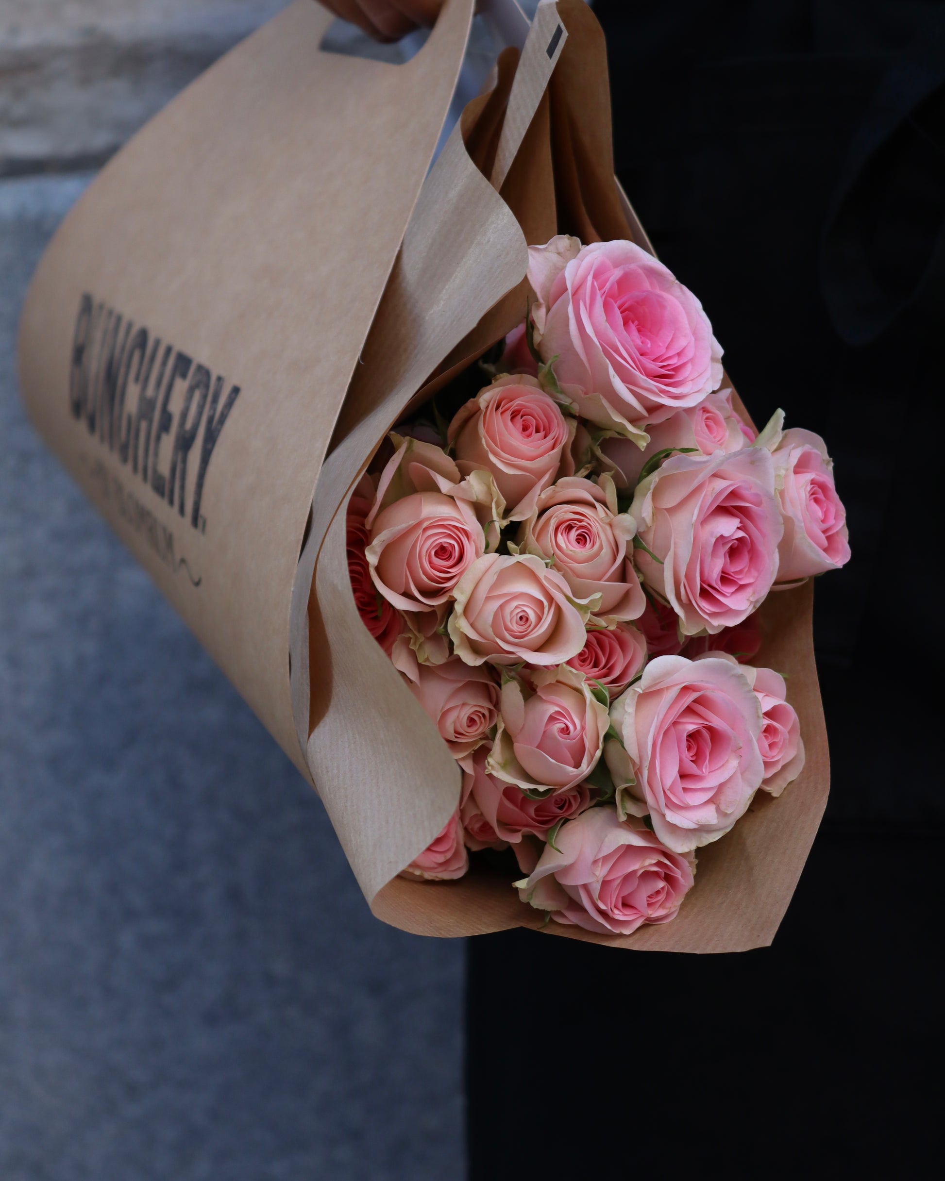 En ljuvlig kvistros rosa toner. Passar fint tillsammans med en bunt eucalyptus och limonium. Tänk på att göra ett långt diagonalt snitt på dina rosor så de får mycket yta att dricka vatten från. Rensa stjälkarna på blad så det inte finns några under vattenytan.