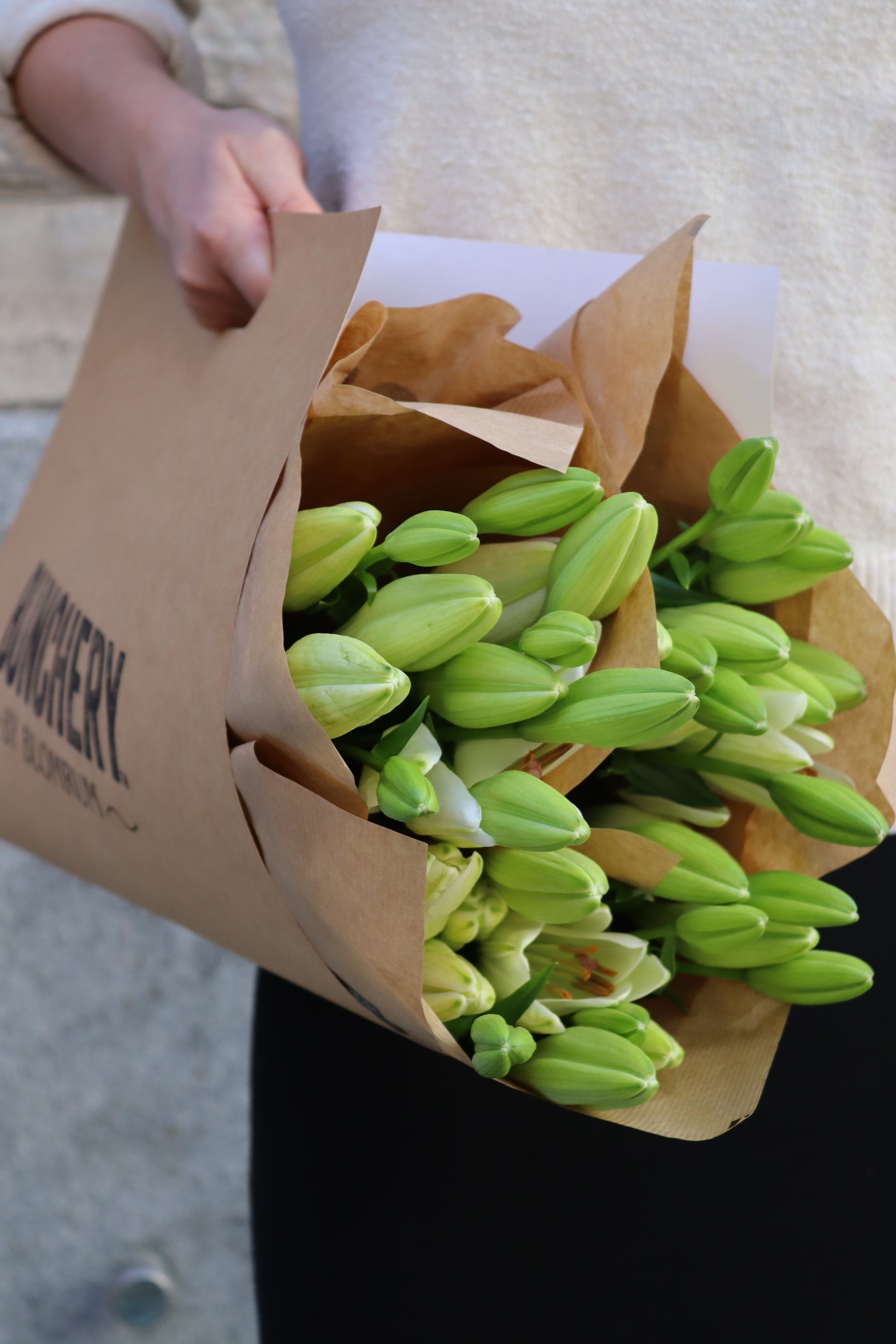 Liljor är en tidlös och hållbar favorit med stora trumpetformade blommor. För att undvika pollenfläckar och förlänga hållbarheten på dina liljor kan du ta bort ståndarna. Denna snittblomma kommer doftfri.