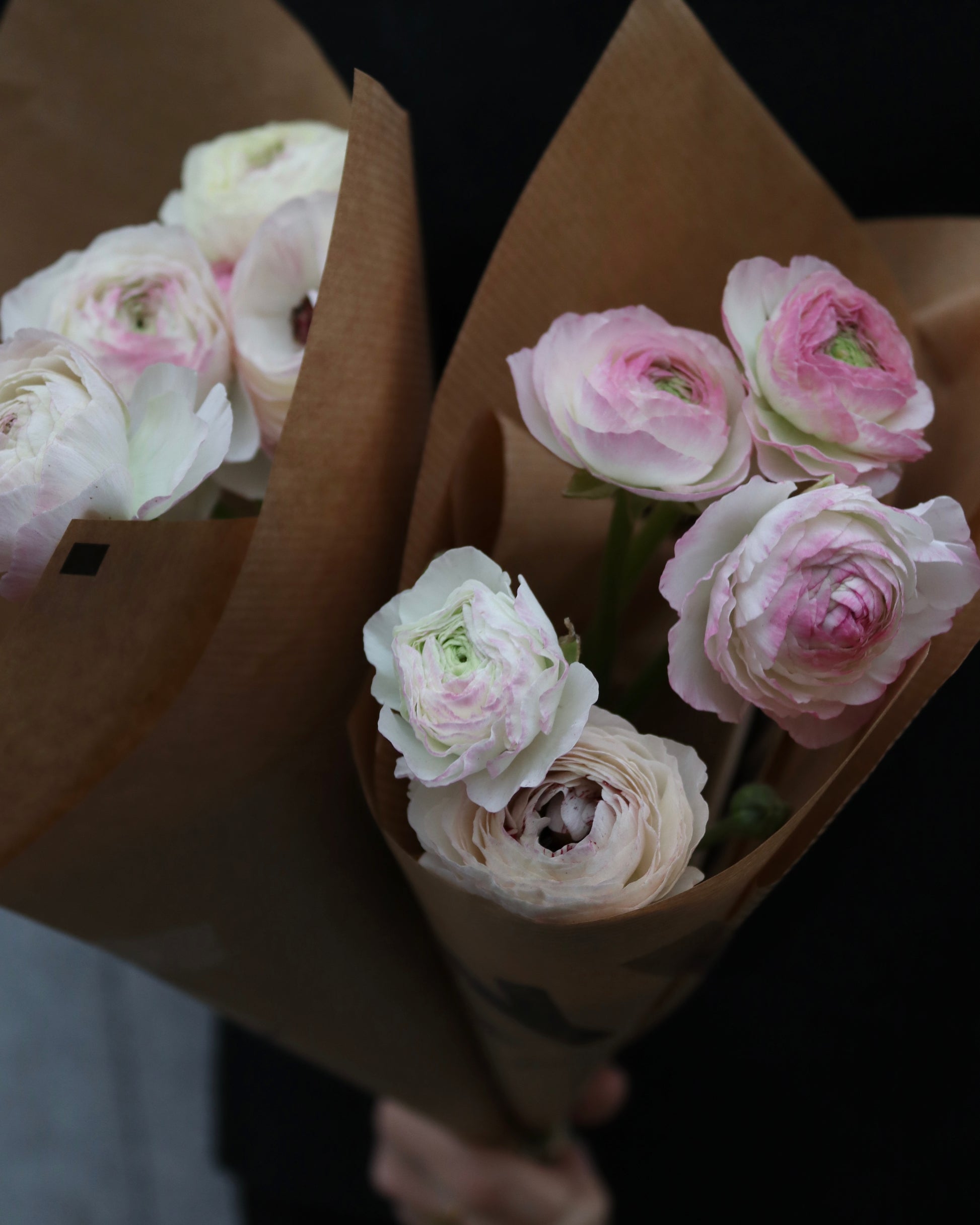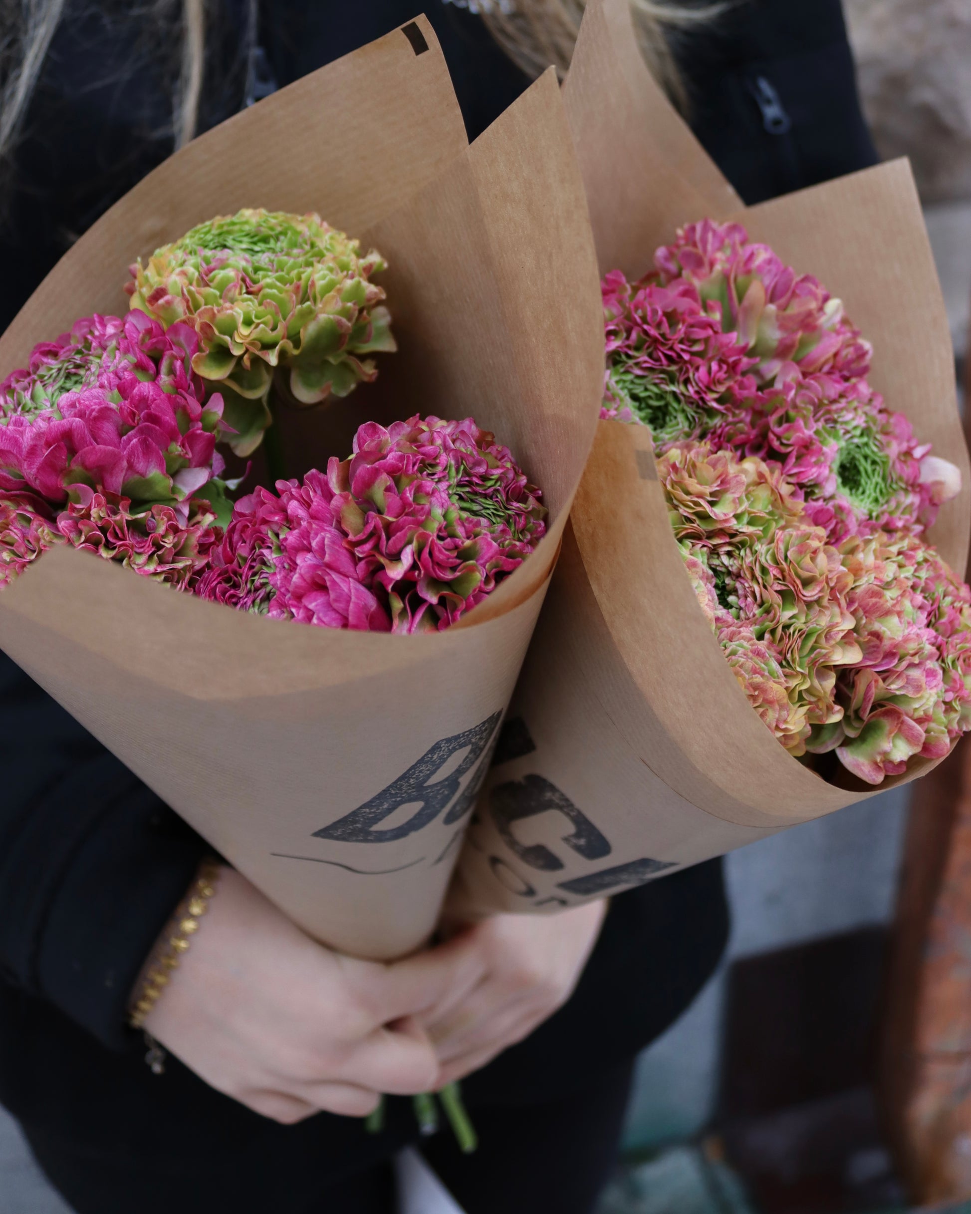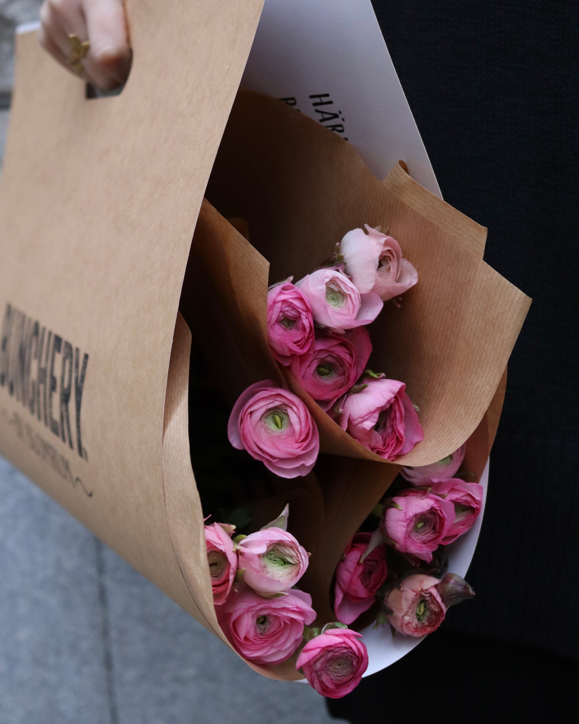 Ranunkeln är en stor favorit för många med sina nästan rosliknande blad. Passar fint tillsammans med en bunt tulpaner och grönt.
