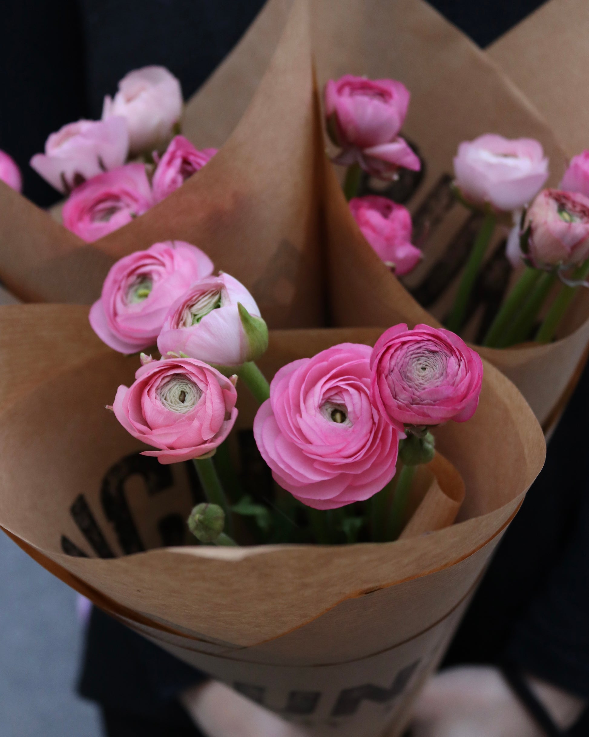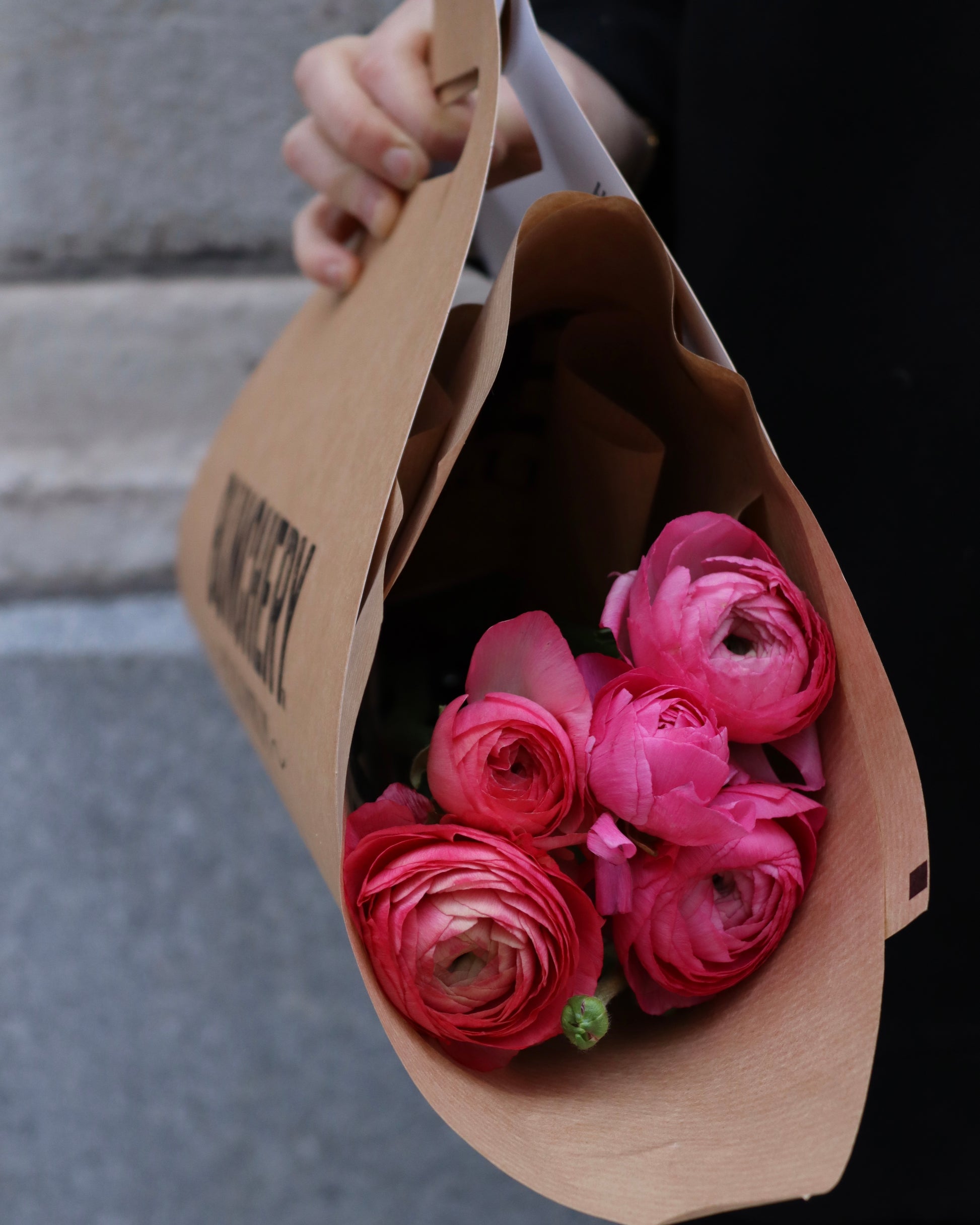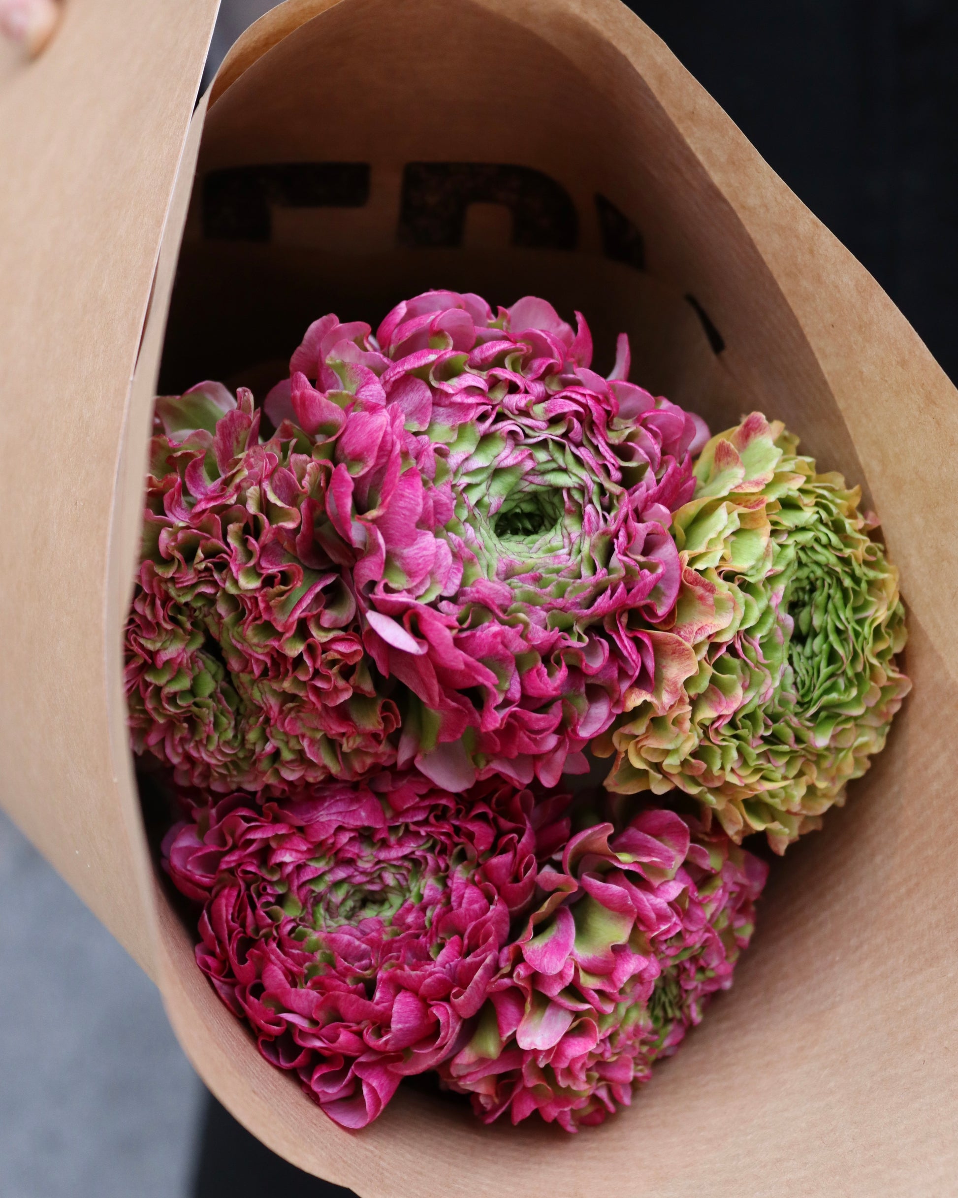 Ranunkeln är en stor favorit för många med sina nästan rosliknande blad. Passar fint tillsammans med en bunt tulpaner och grönt.
