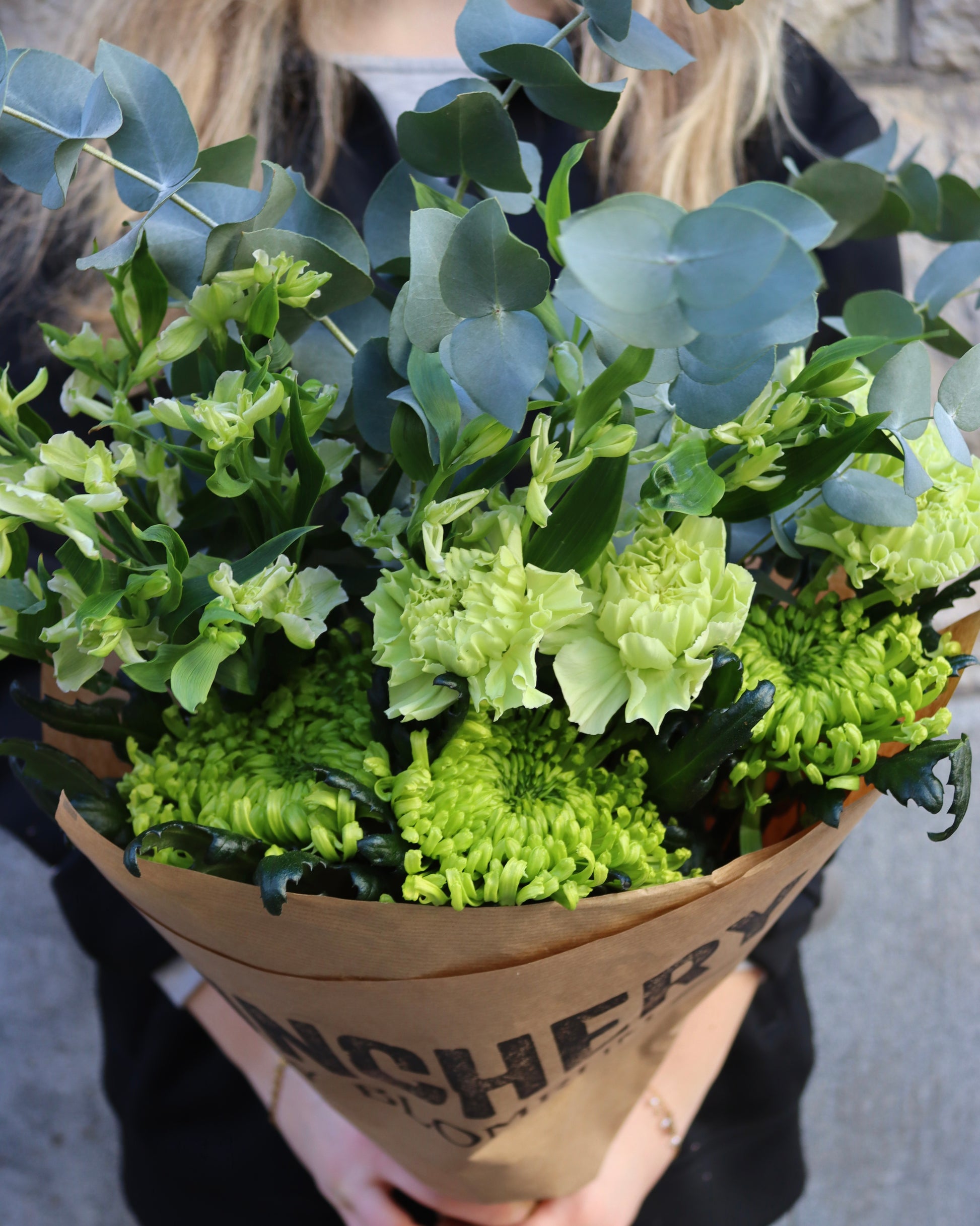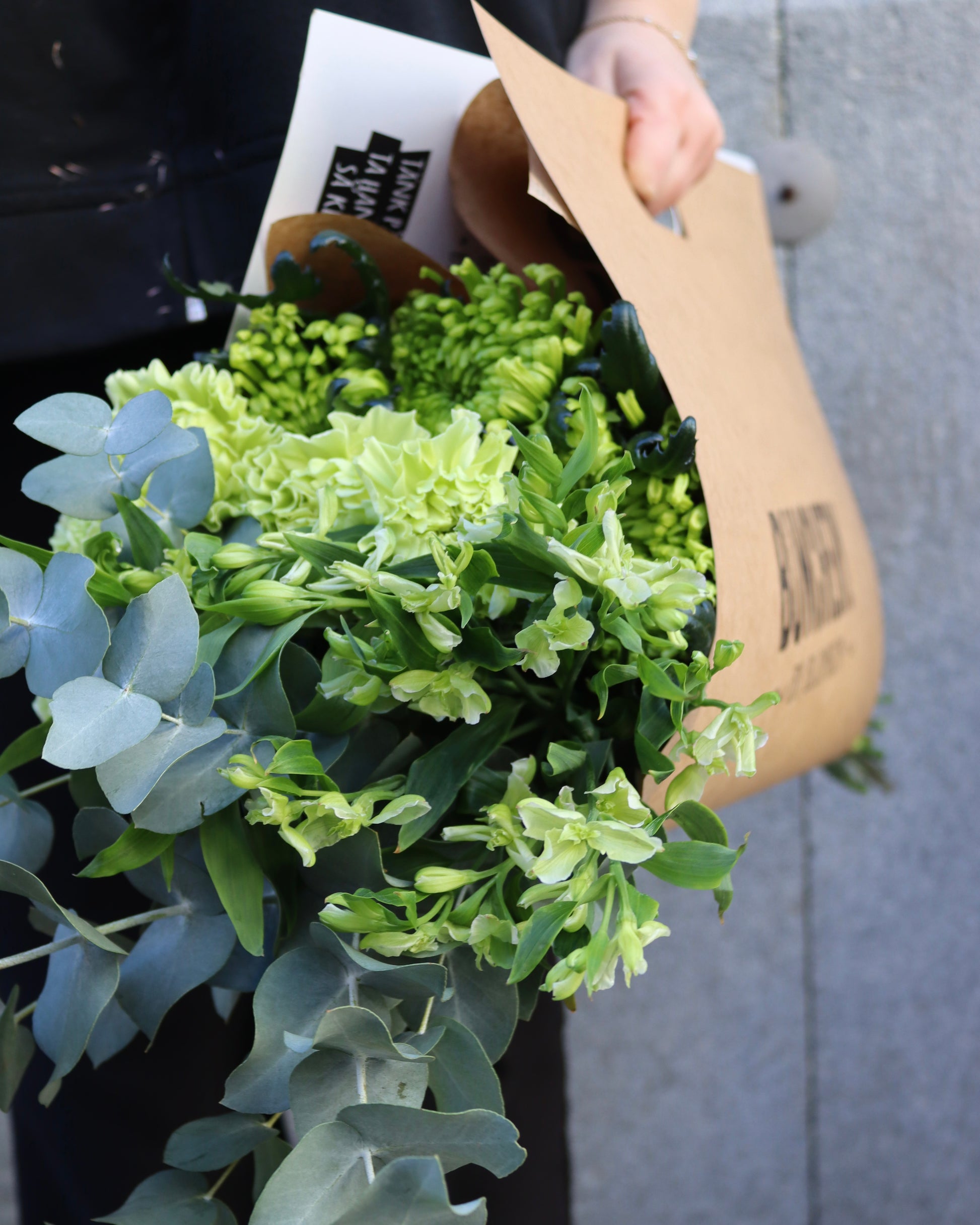 Buncherys Val- i denna väska hittar du en blandning med säsongens finaste snittblommor i lime och gröna toner tillsammans med passande grönt.
