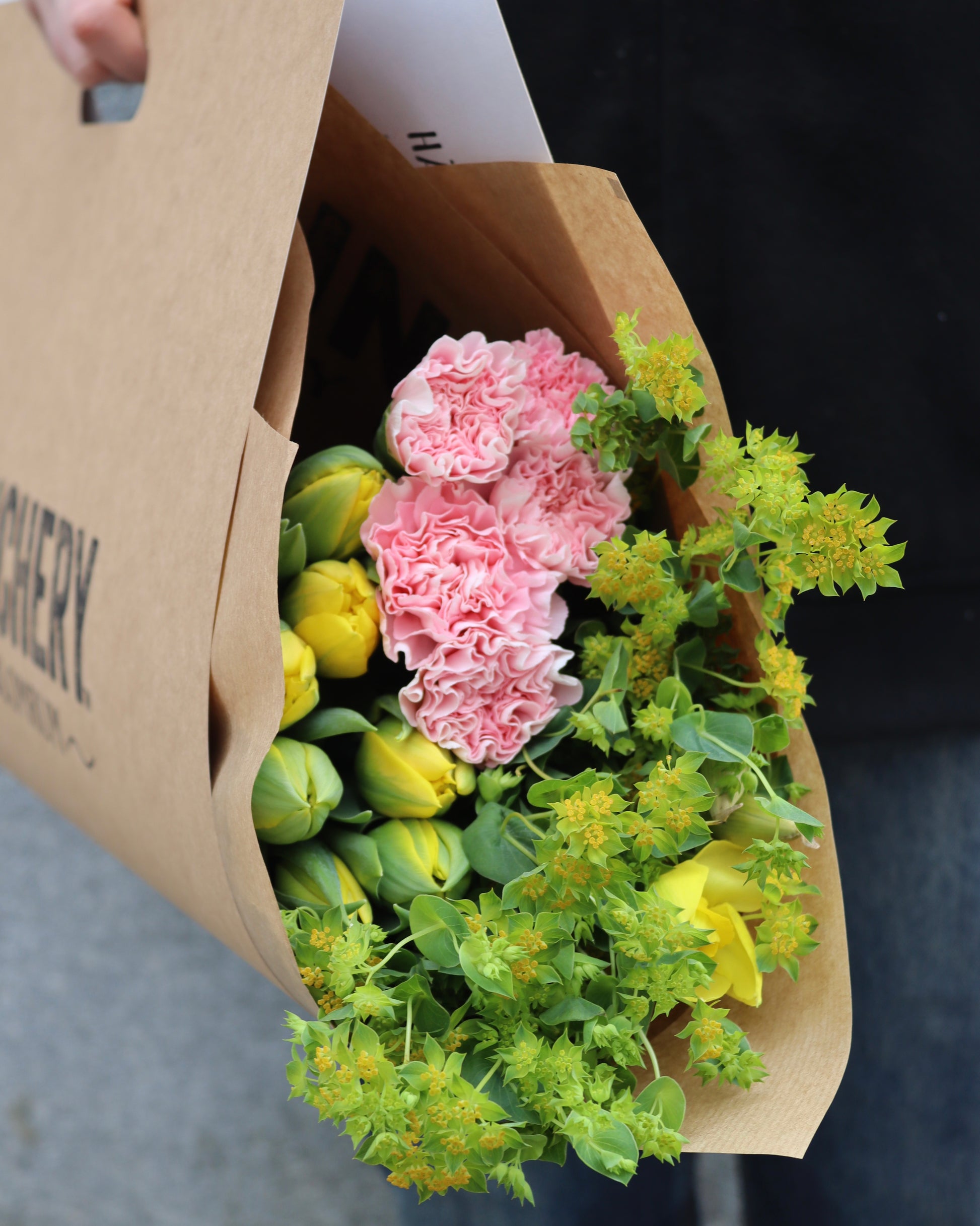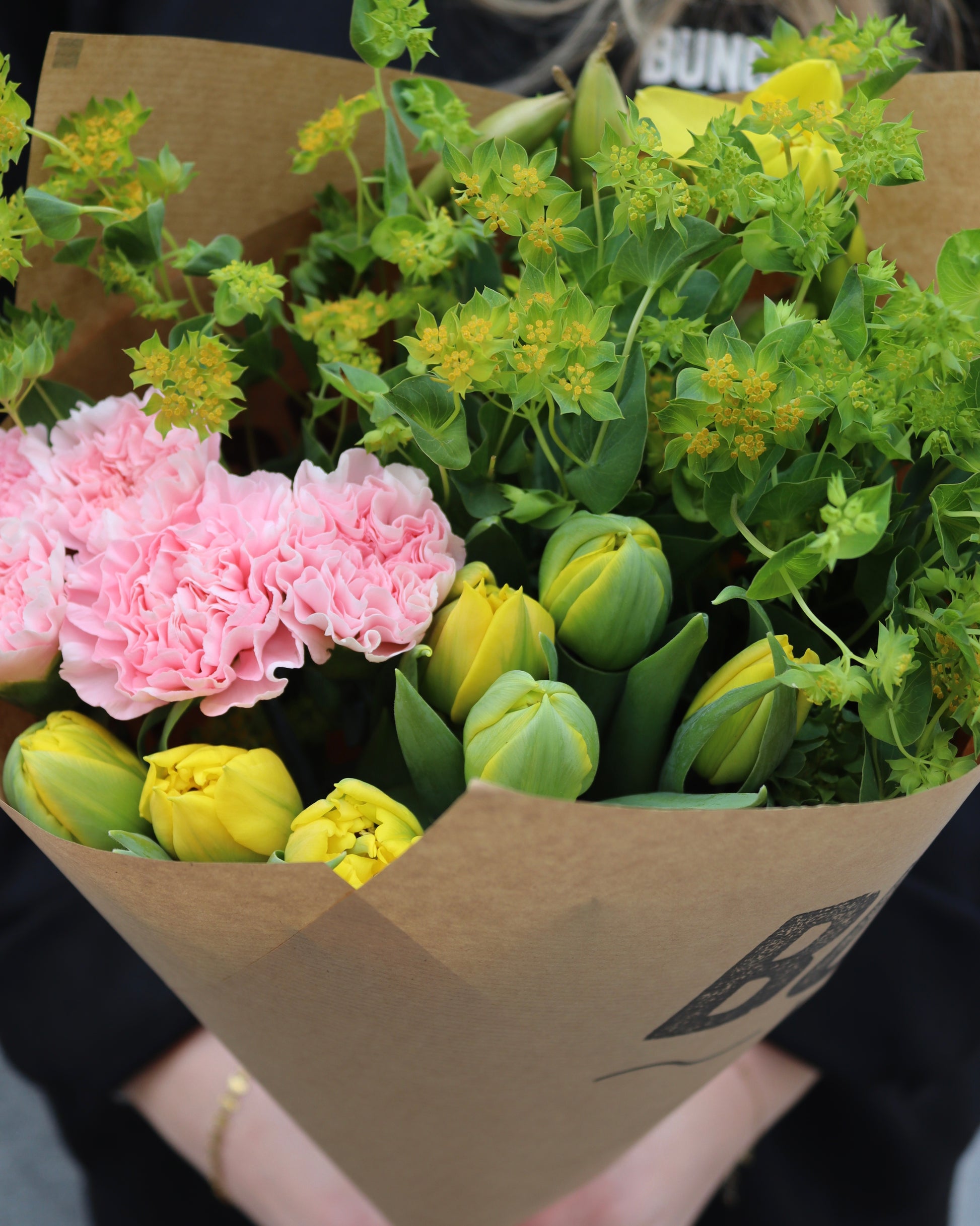 Buncherys val- i denna väska hittar du en blandning med säsongens finaste påskbuntar i färgglada och gula toner tillsammans med passande grönt eller kvistar. Denna väska kan innehåller tulpaner och påskliljor - placera i kallt vatten med raka snitt.