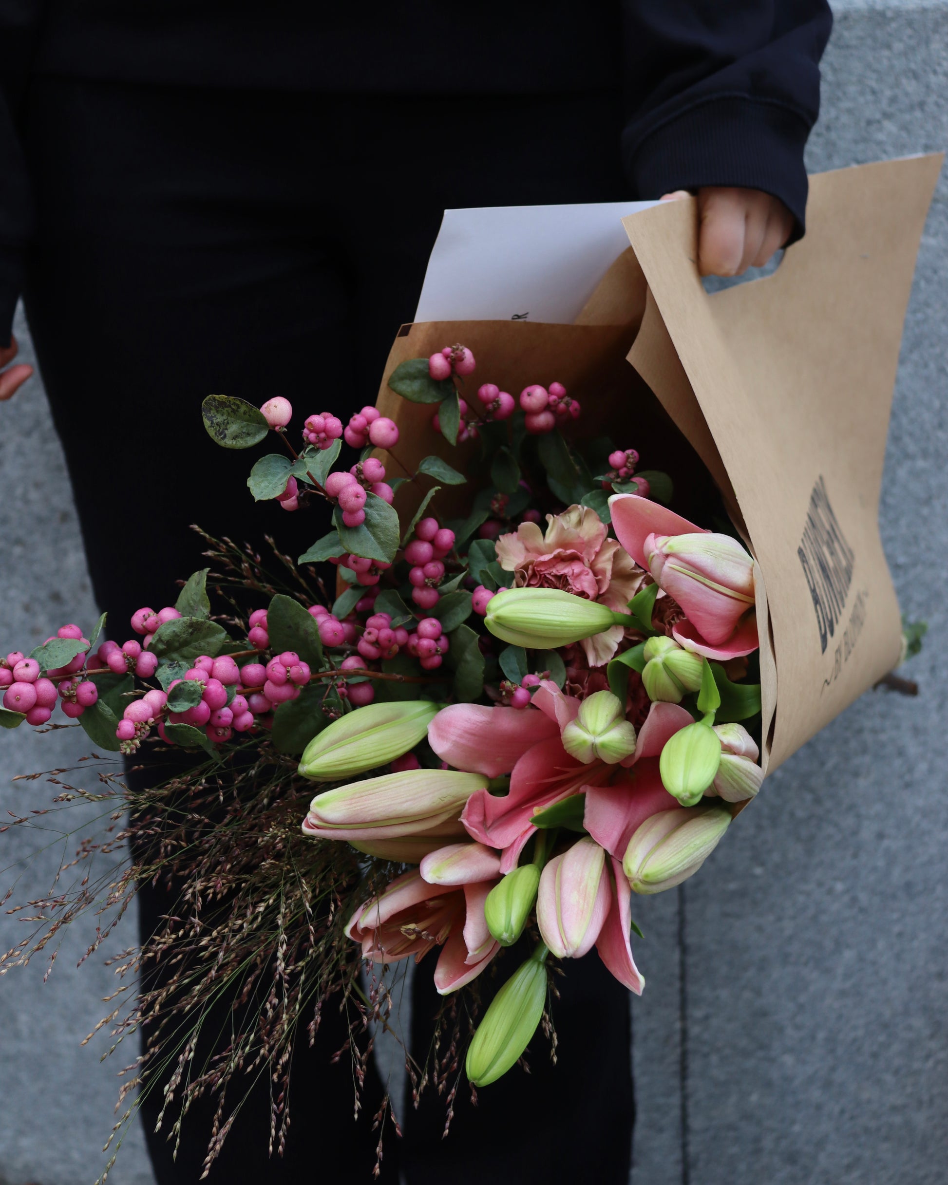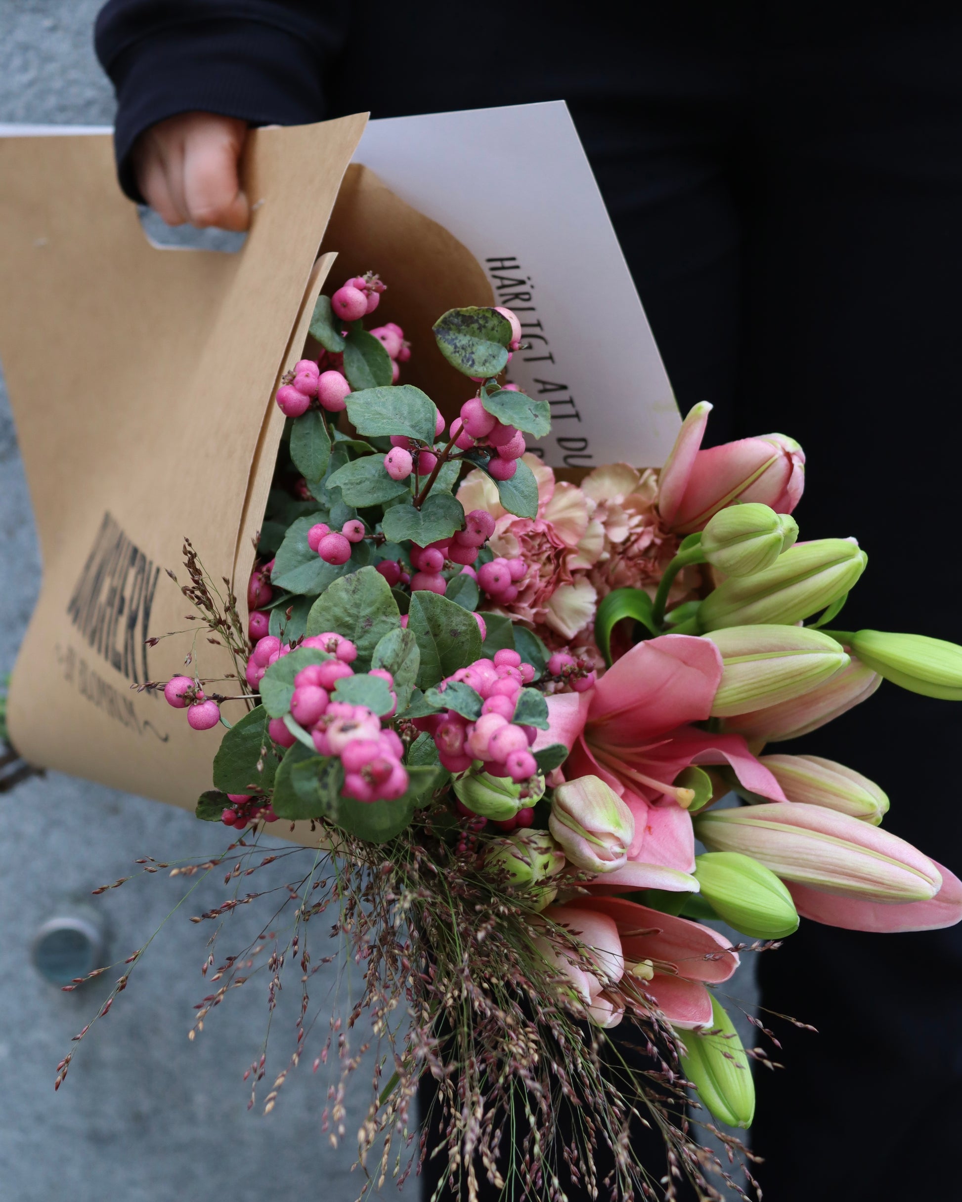 Buncherys val- i denna väska hittar du en blandning med säsongens finaste snittblommor i rosa toner tillsammans med passande grönt.