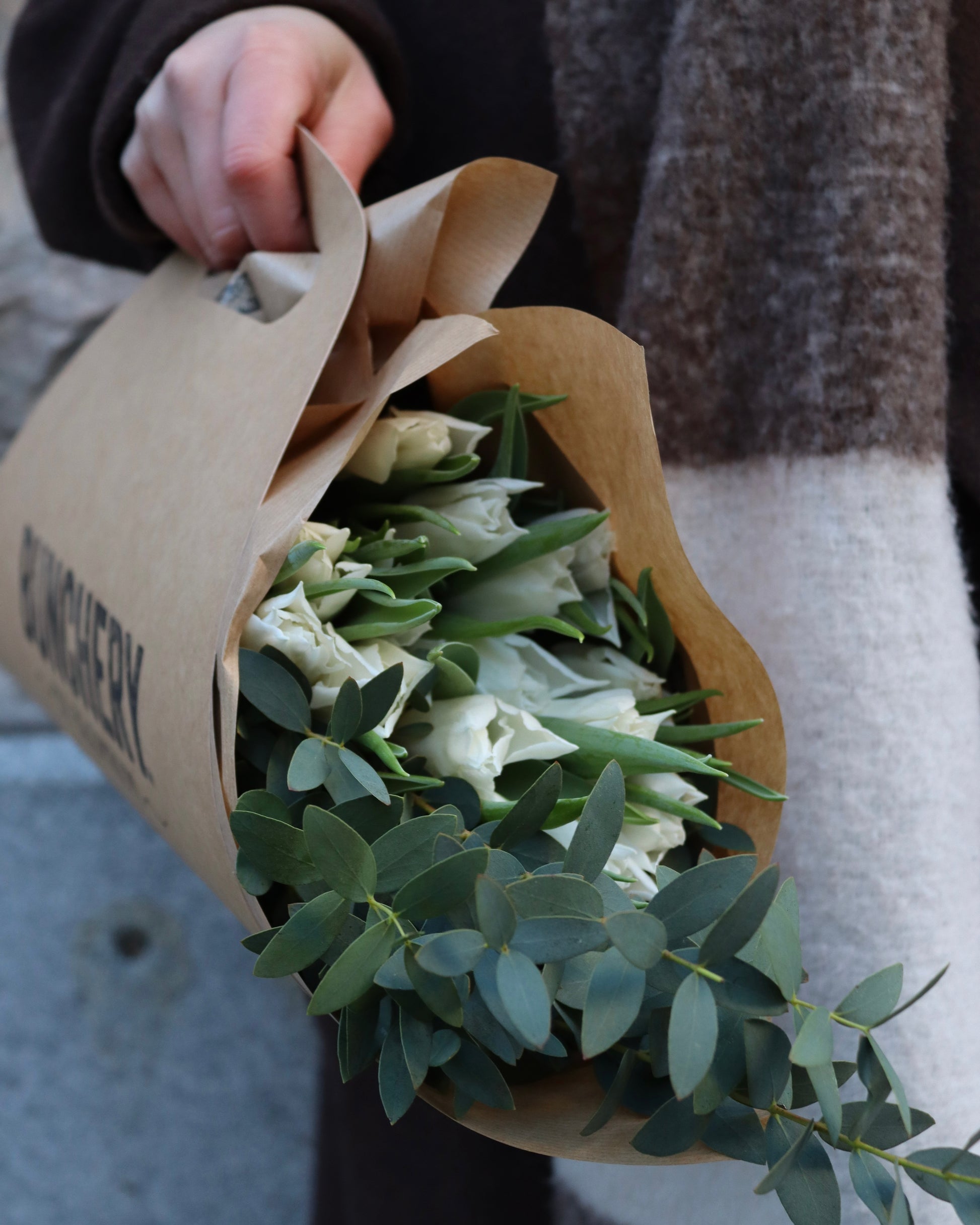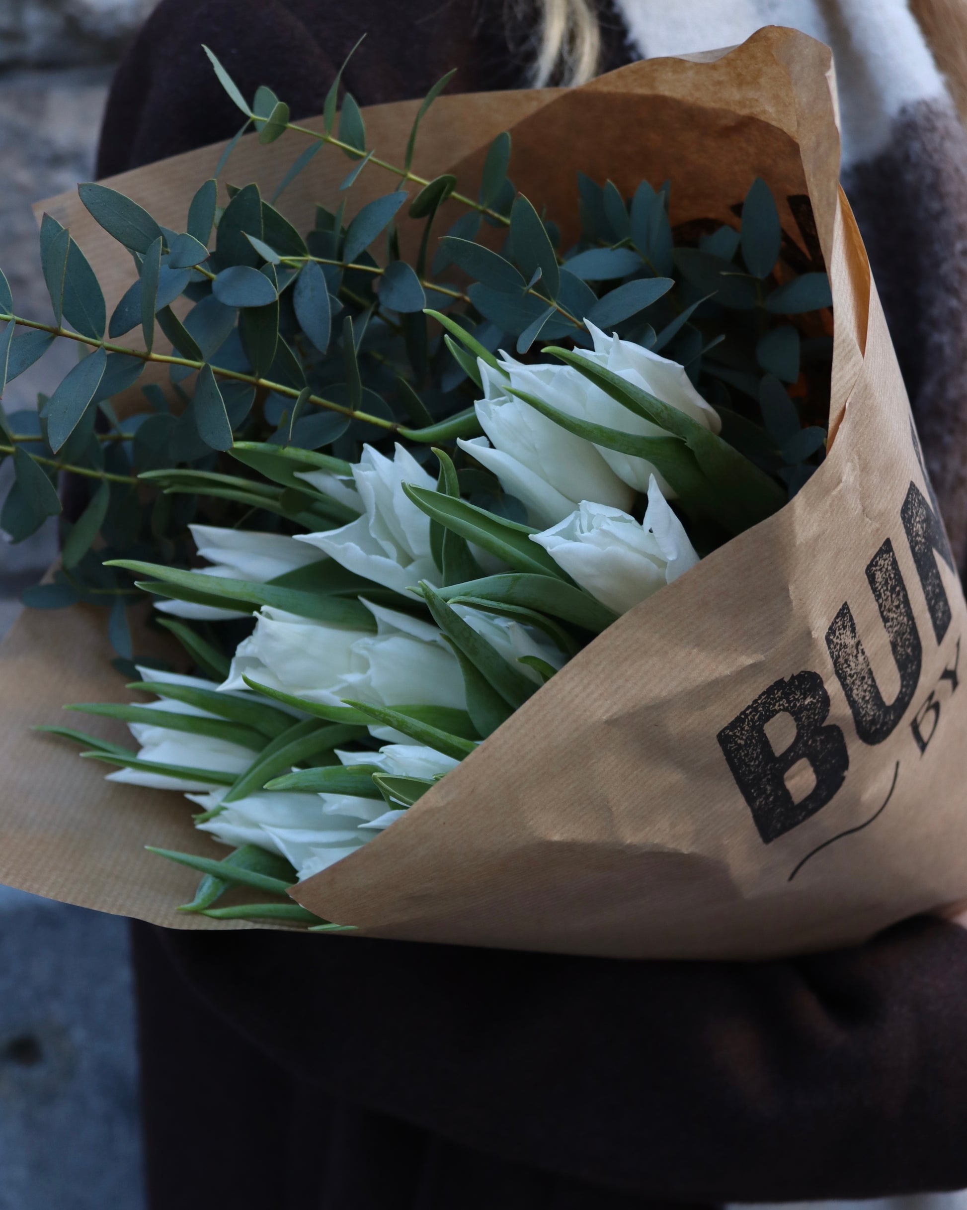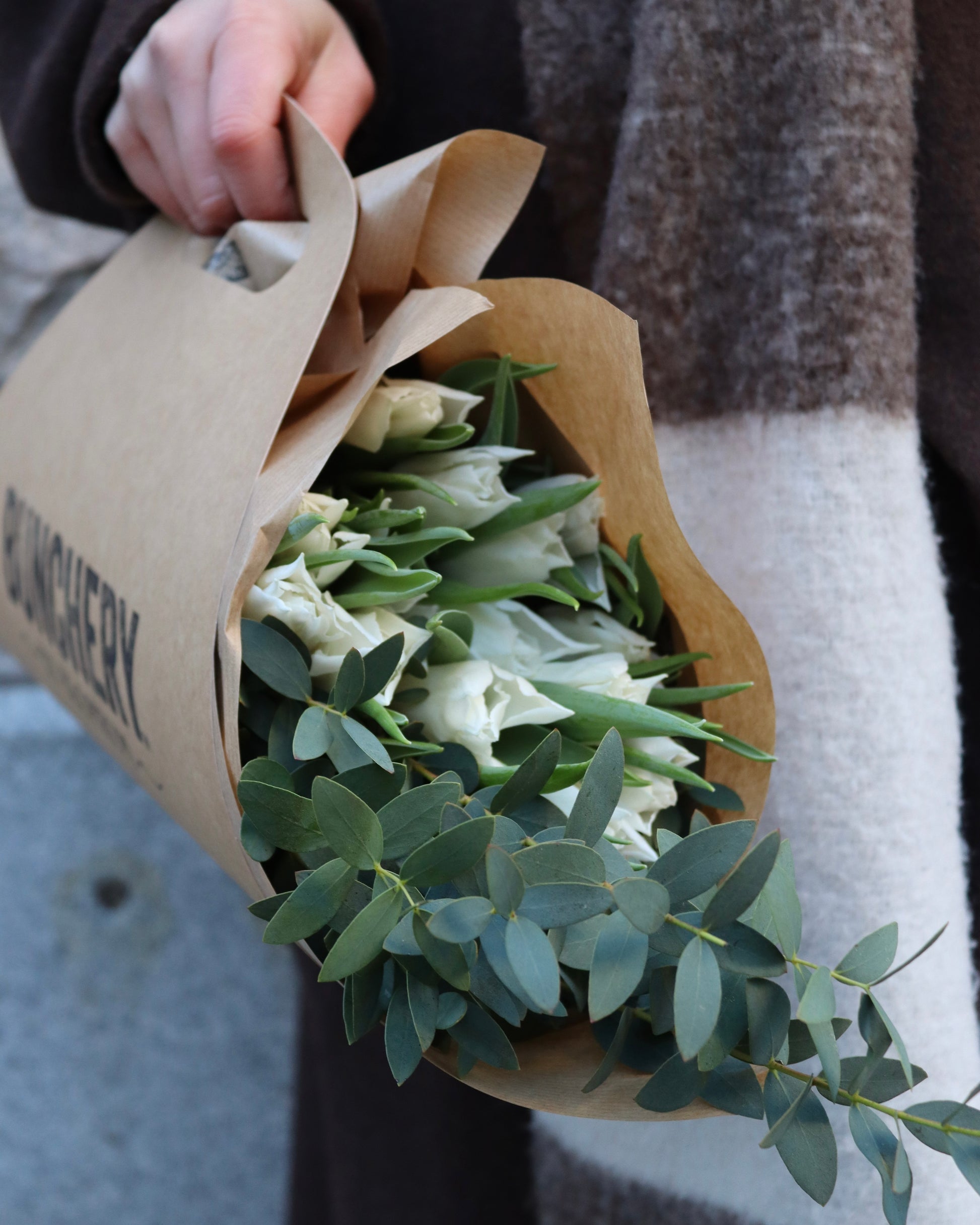 Buncherys val- i denna väska hittar du två buntar av dagens finaste tulpaner i varierande färg som vit eller rosa, tillsammans med säsongens passande grönt. Sort och färg varierar beroende på sortiment för dagen. Passar perfekt att lysa upp din nyårsmiddag!
