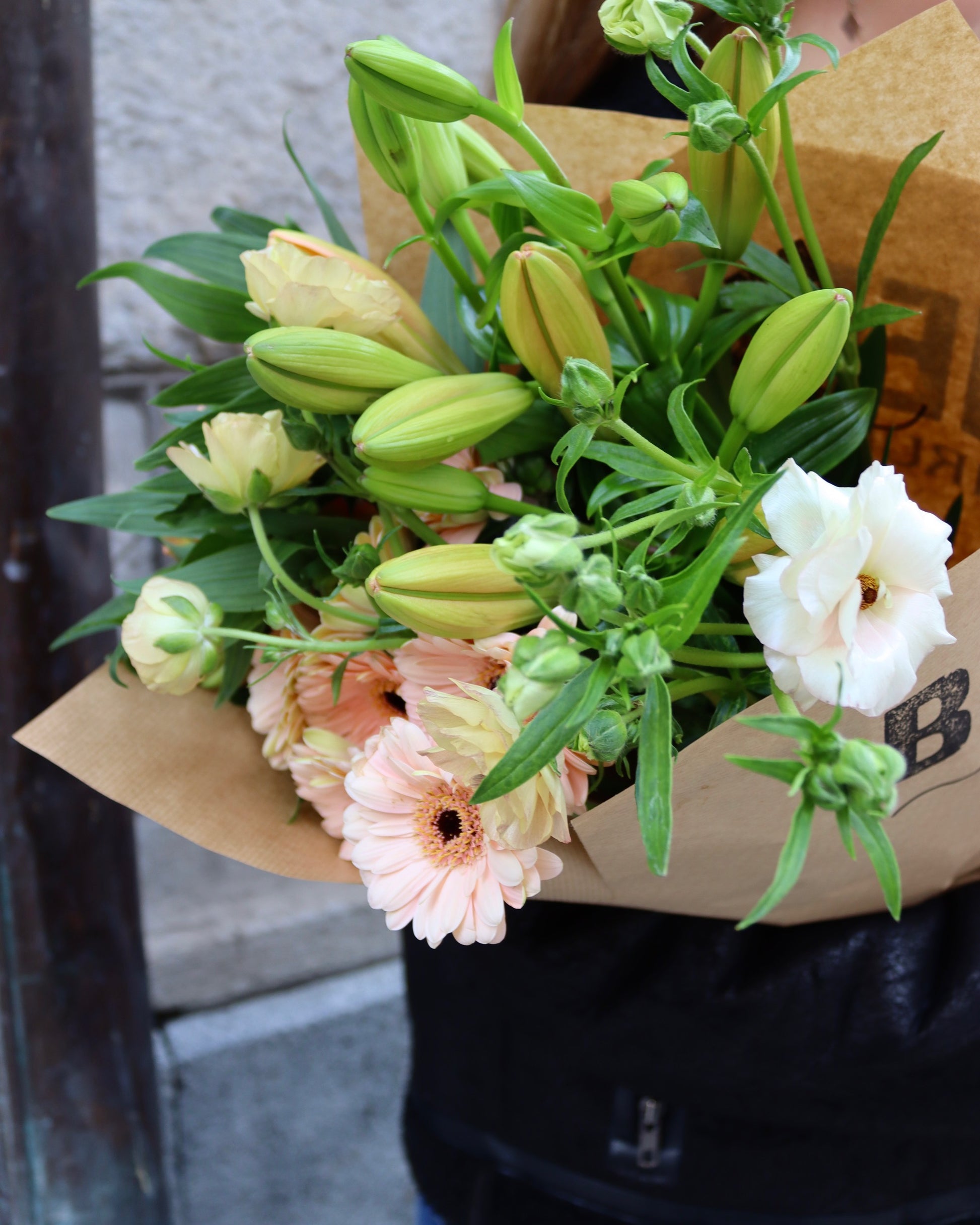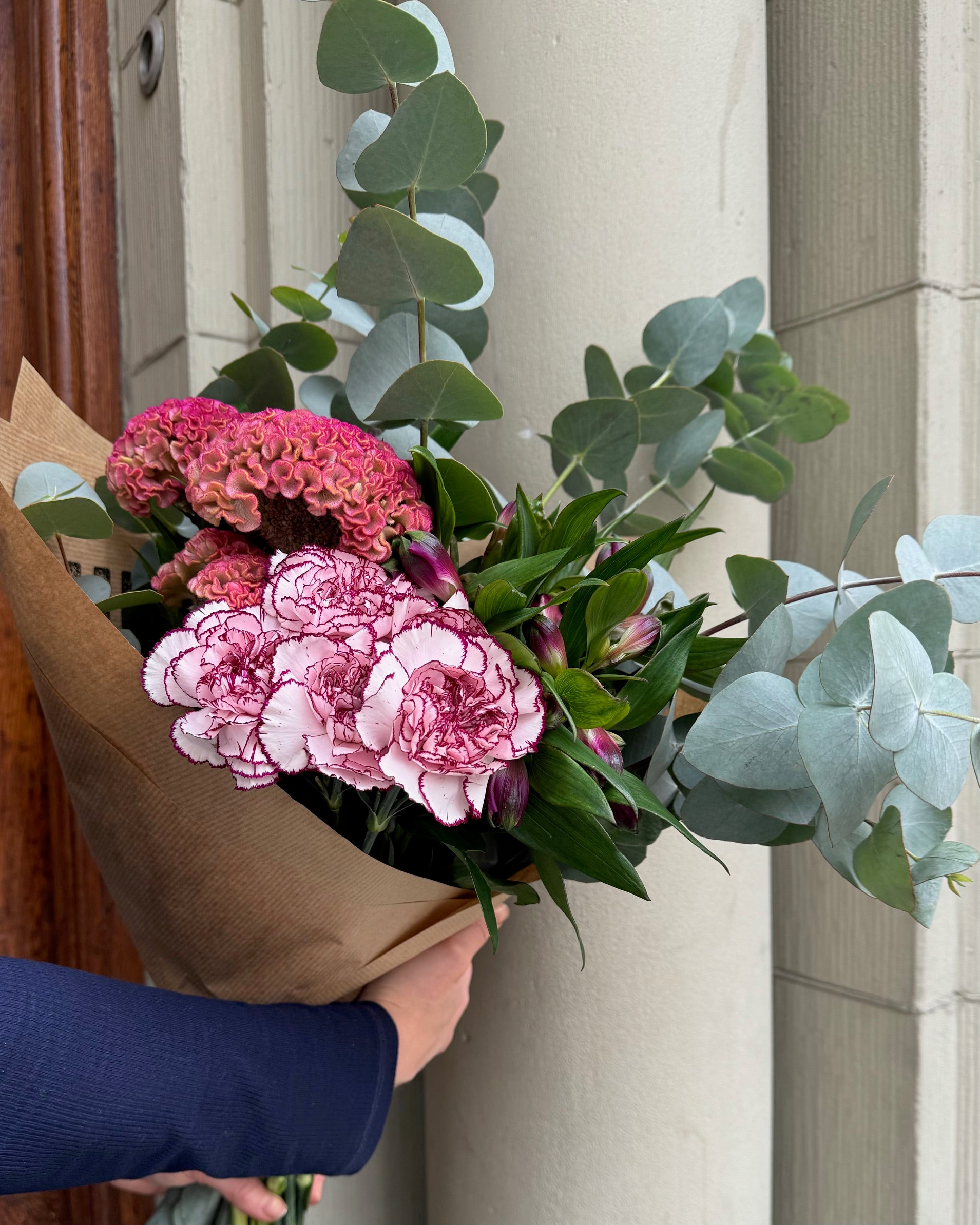 Buncherys val- Vi väljer! I denna väska väljer vi säsongens finaste buntar i en smakfull kombination med varierande färger tillsammans med passande grönt. Vi väljer en väska med snittblommor just för dig och därav varierar både blommor och nyanser från väska till väska. Bilden visar ett exempel.