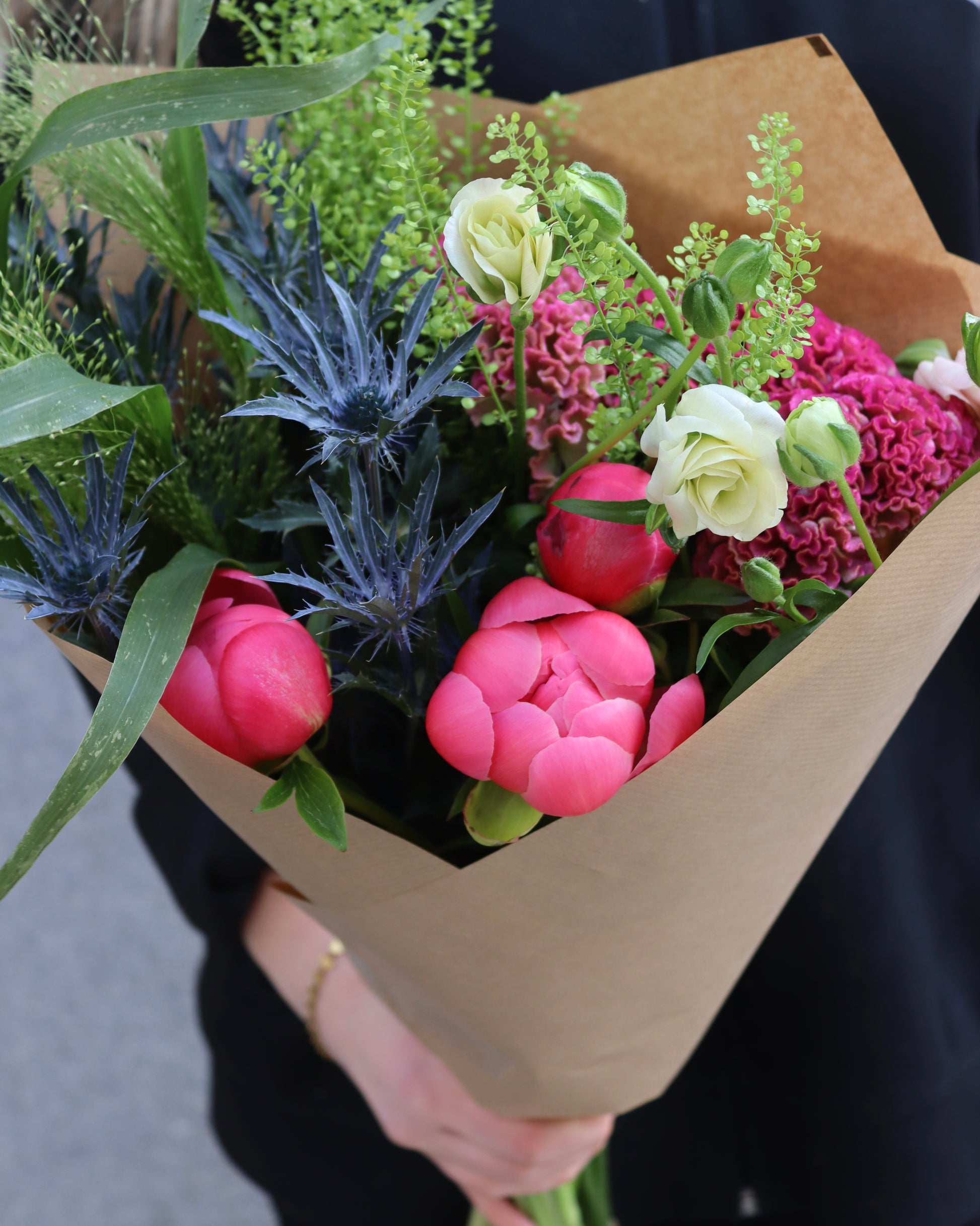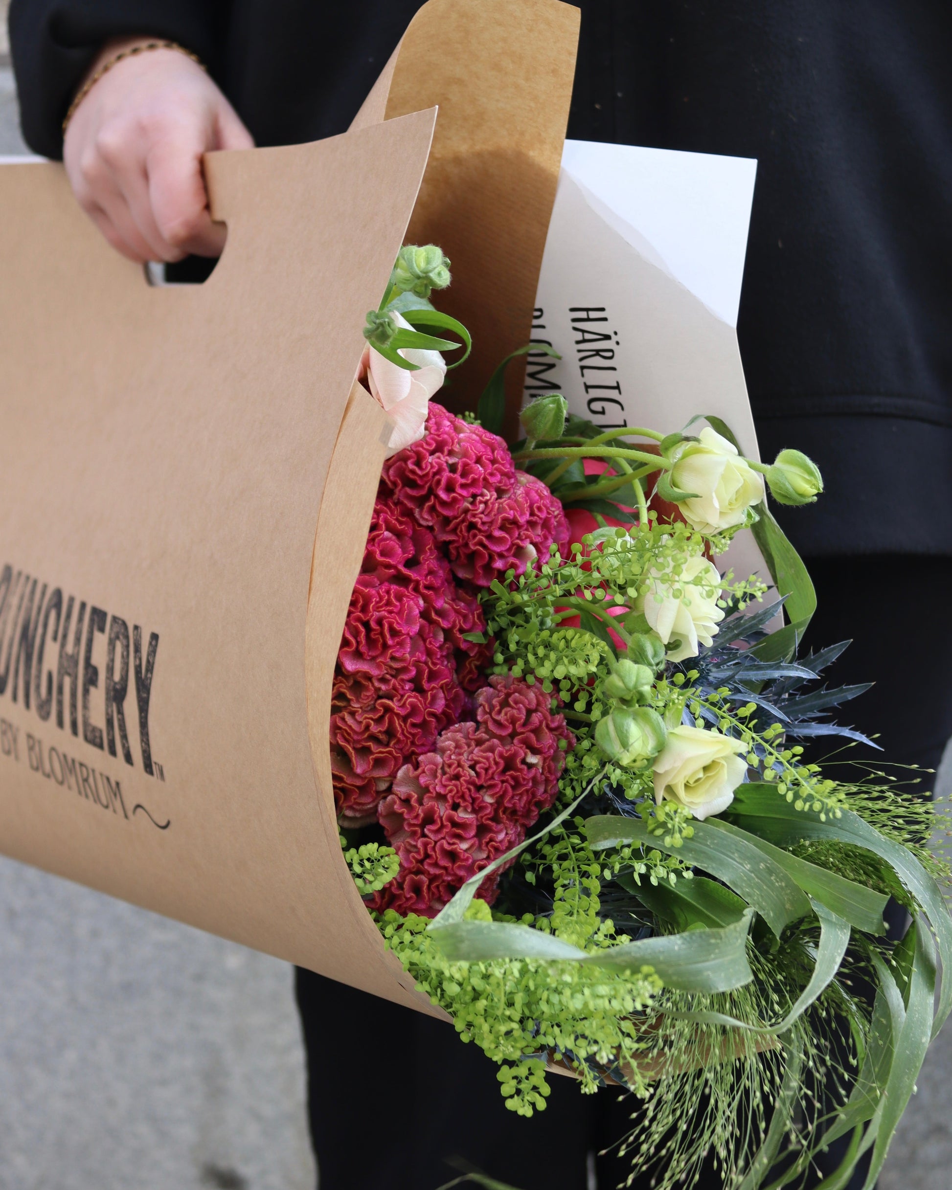 Buncherys val- Vi väljer! I denna väska väljer vi säsongens finaste buntar i en smakfull kombination med varierande färger tillsammans med passande grönt. Vi väljer en väska med snittblommor just för dig och därav varierar både blommor och nyanser från väska till väska. Bilden visar ett exempel, varierar också beroende på vilken storlek du väljer.
