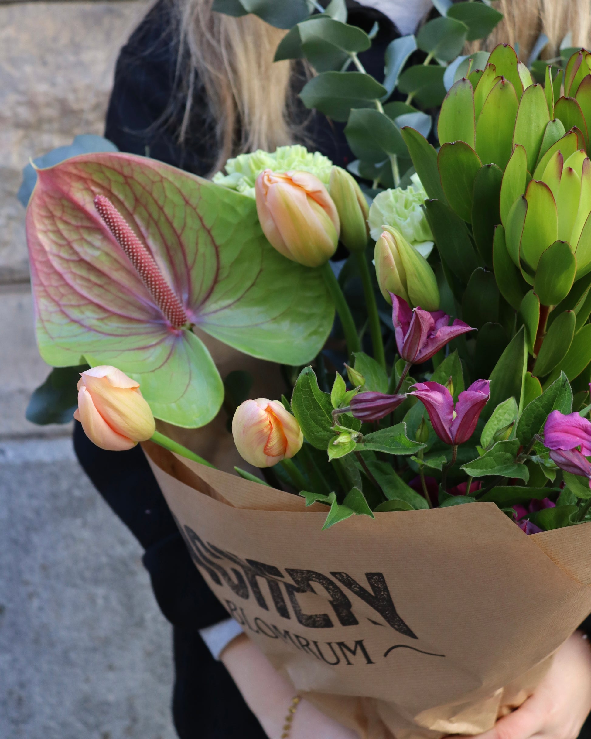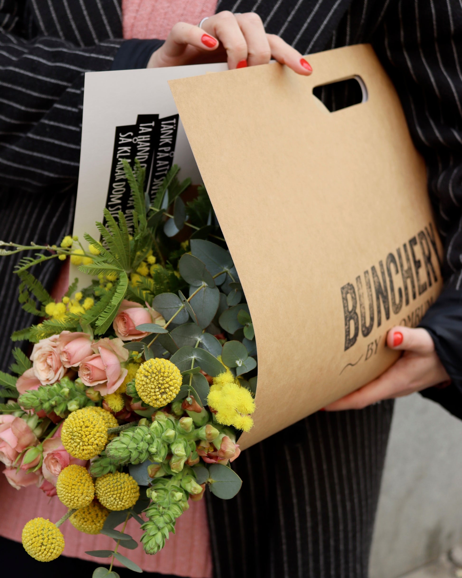 Buncherys val- Vi väljer! Lyx. I denna väska väljer vi flera av säsongens finaste buntar i en smakfull kombination med varierande färger tillsammans med passande grönt. Denna väska har flera buntar för att du ska kunna skapa ett stort och fylligt arrangemang i din vas. Vi väljer en väska med snittblommor just för dig och därav varierar både blommor, färger och nyanser från väska till väska. Bilden visar ett exempel.