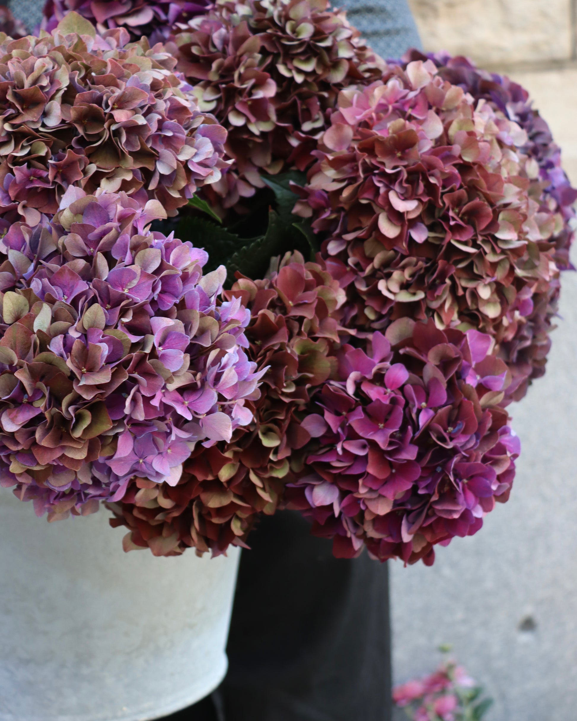 Hortensia är en imponerade blomma med lyxig känsla. Dess stora bollformade blomställningar består av många små blommor och skapar tillsammans en fin volym och textur. Denna snittblomma kommer i en lila ton, kan variera från mörkare till starkare nyans beroende på dagens sortiment. Hösthortensian går ven fint att torka.