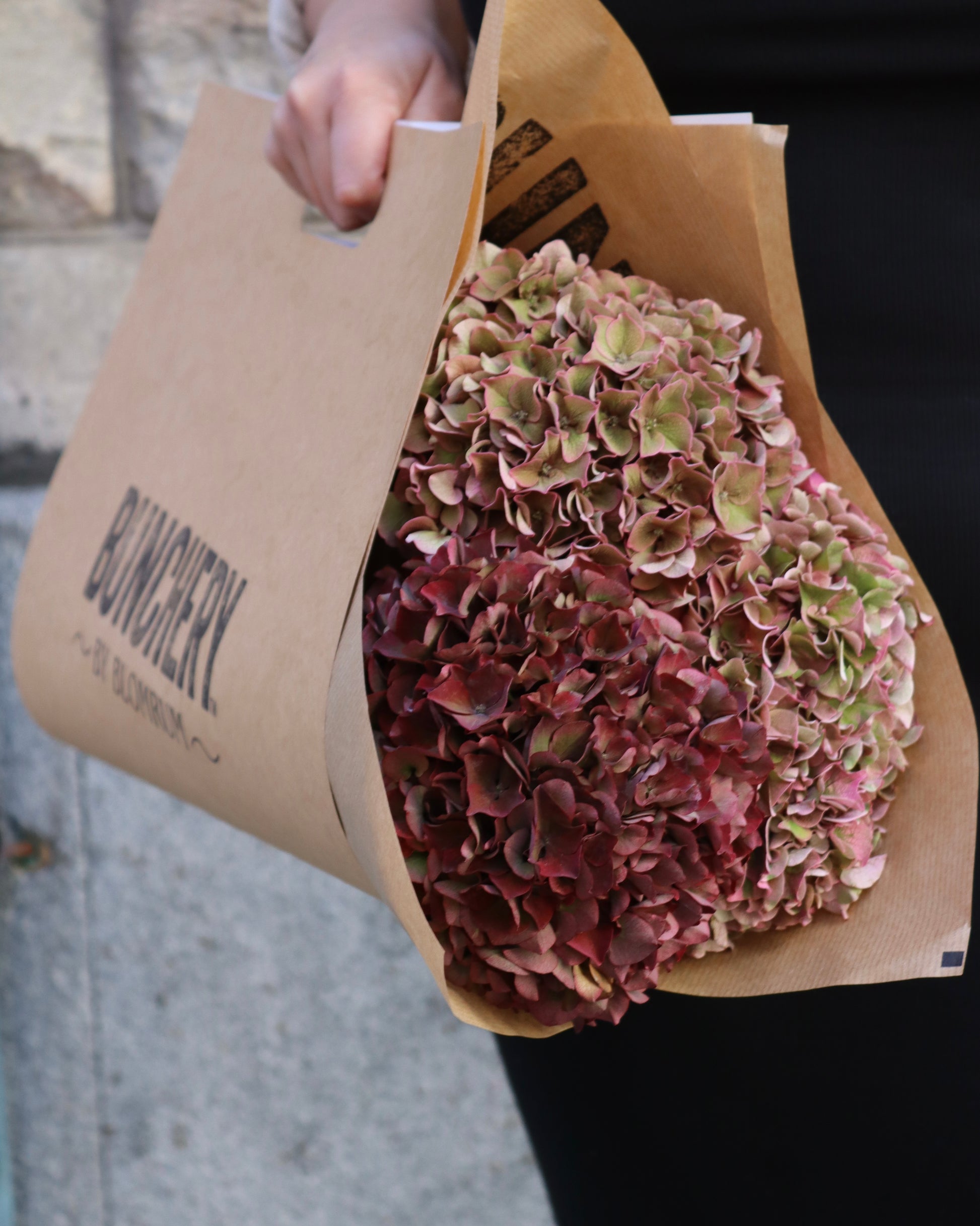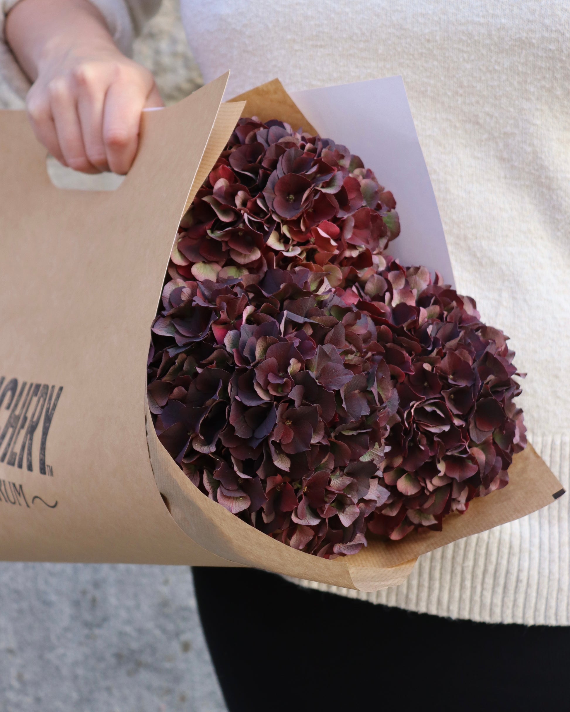 Hortensia är en imponerade blomma med lyxig känsla. Dess stora bollformade blomställningar består av många små blommor och skapar tillsammans en fin volym och textur. Denna bunt kommer i en härlig höstig nyans som kan variera från mörkare röd/rosa nyans.