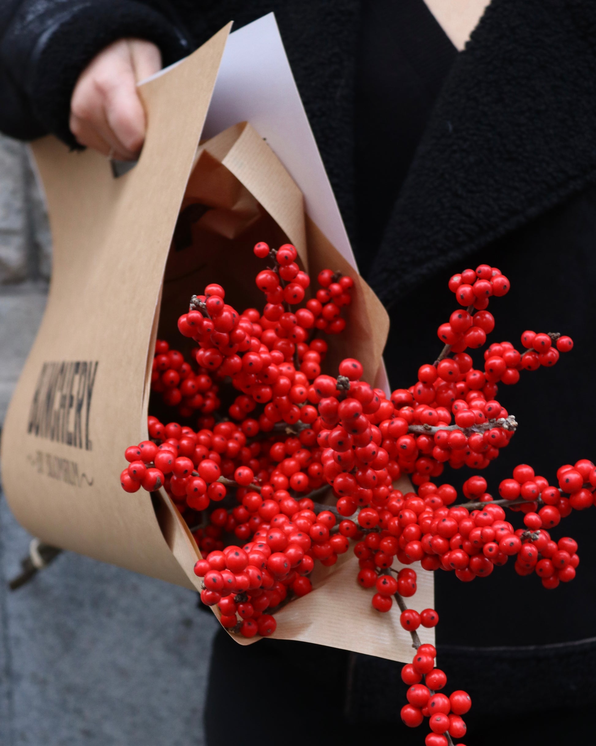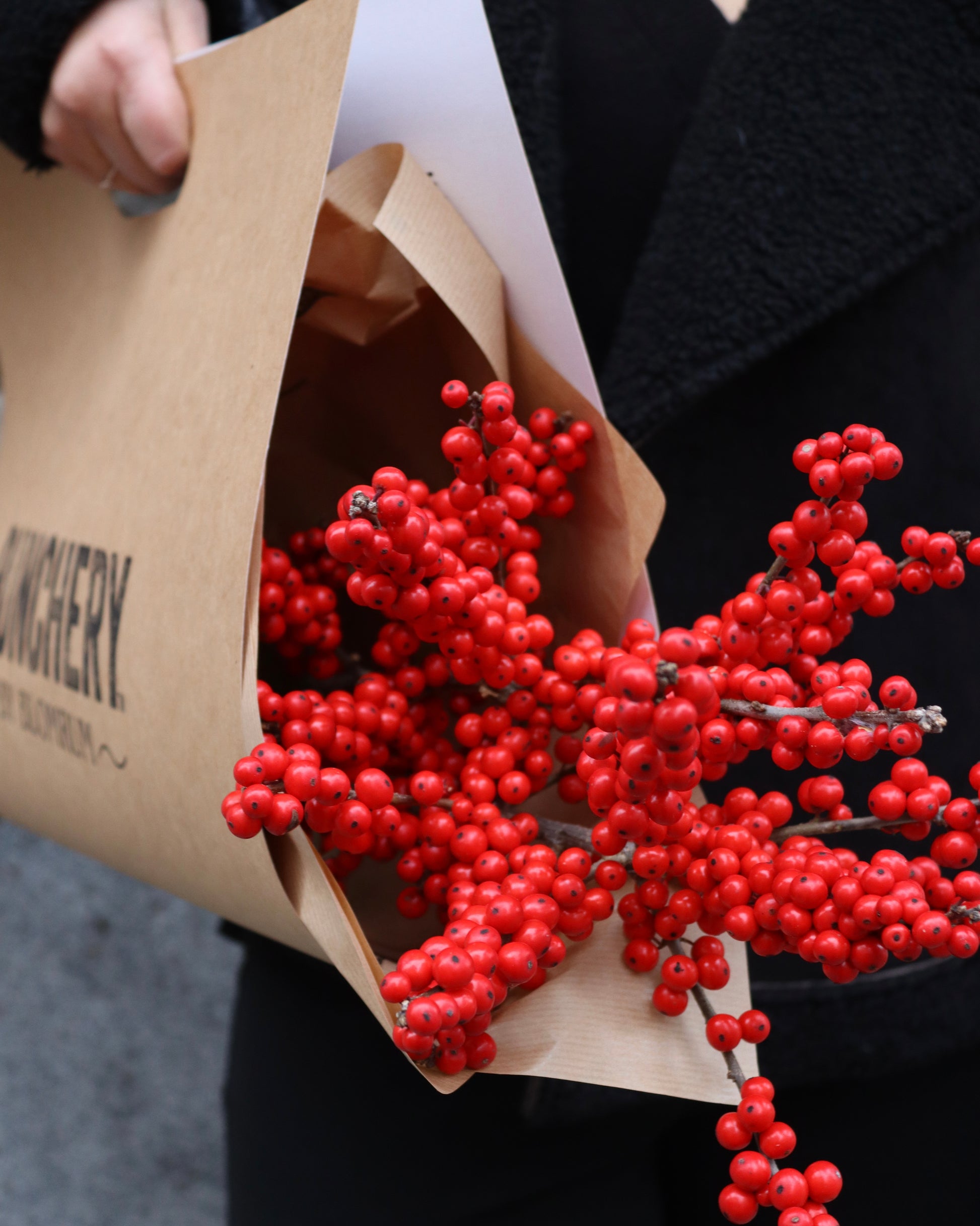 Ilexbär är en dekorativ snittblomma som skiftar i rött. De passar fint till amaryllis och en bunt grönt, men även andra snittblommor.