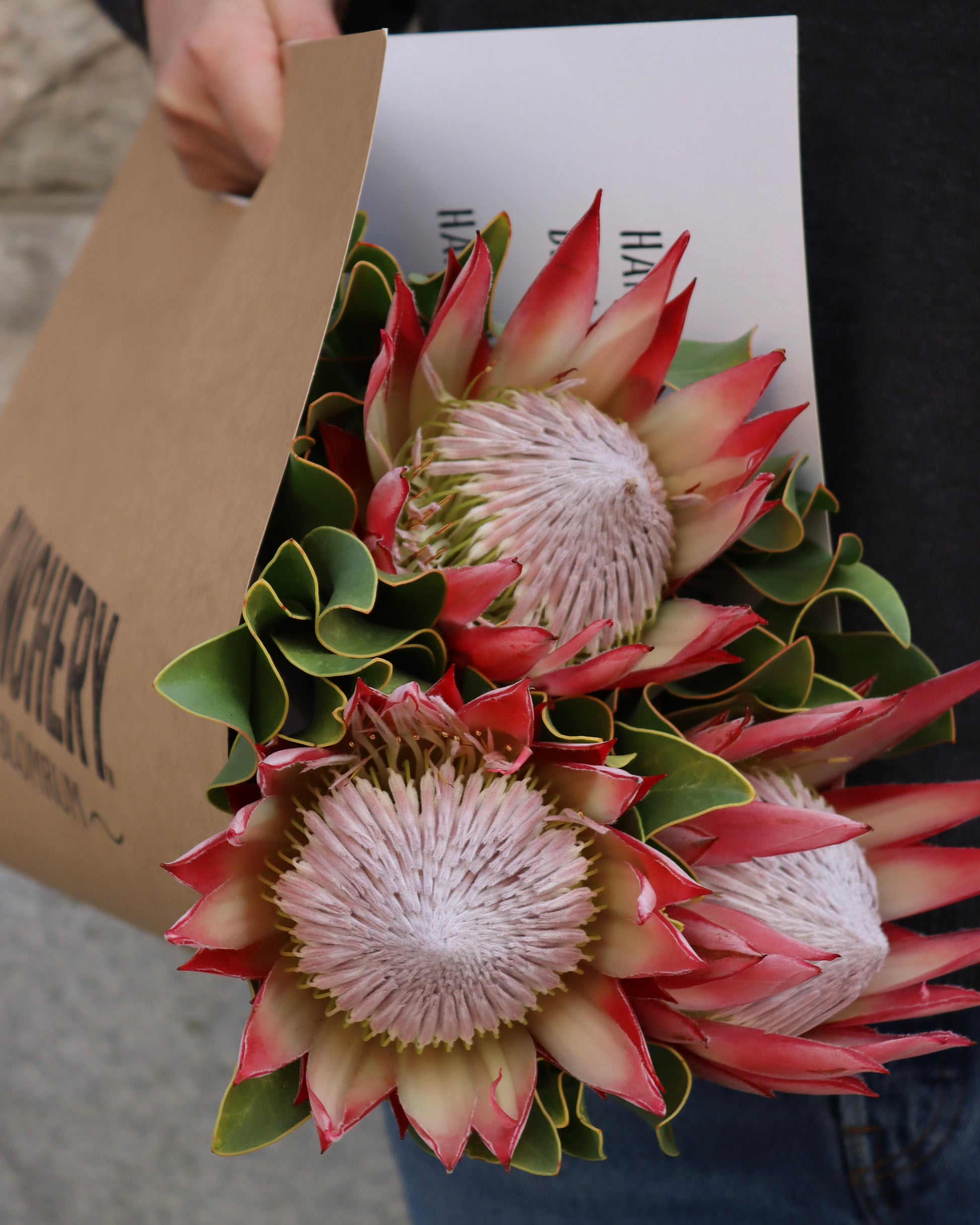 Protea har en unik charm som kan skapa ett fint blickfång till ditt arrangemang. Denna blomma har lång hållbarhet, passar utmärkt som ensam solitär eller tillsammans med andra snittblommor för att skapa något utöver det vanliga.