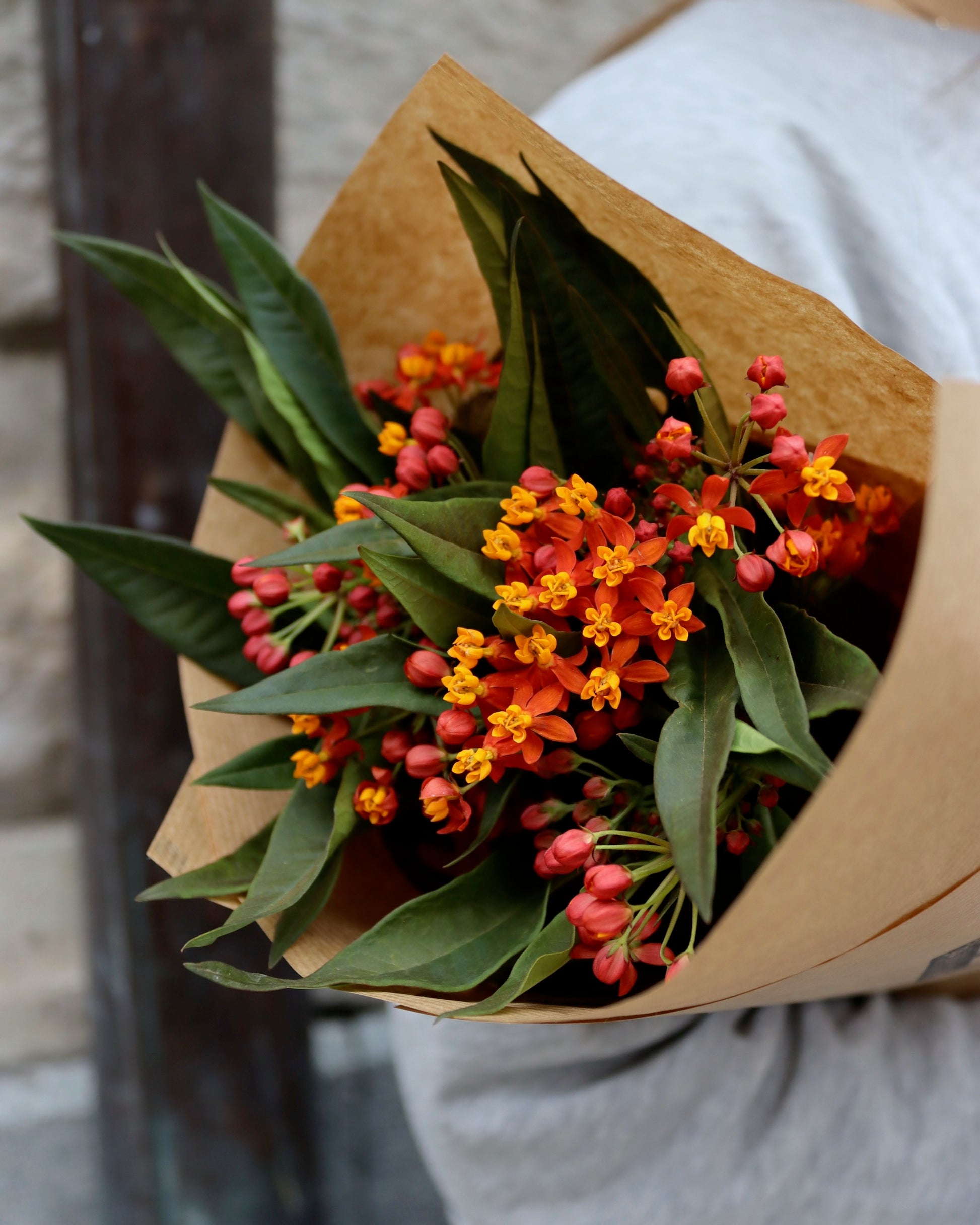Denna Sidenört med orange blommor och gröna blad passar fint tillsammans med både Liljor, Nejlika och en bunt Eucalyptus.