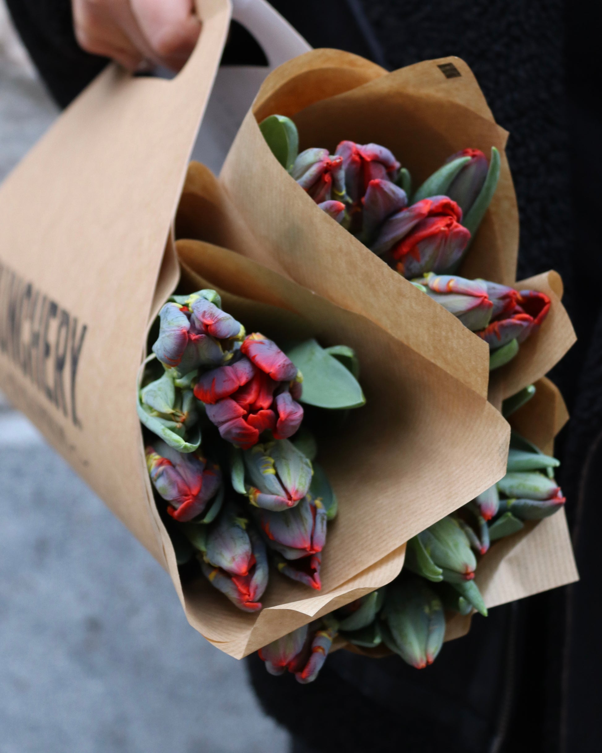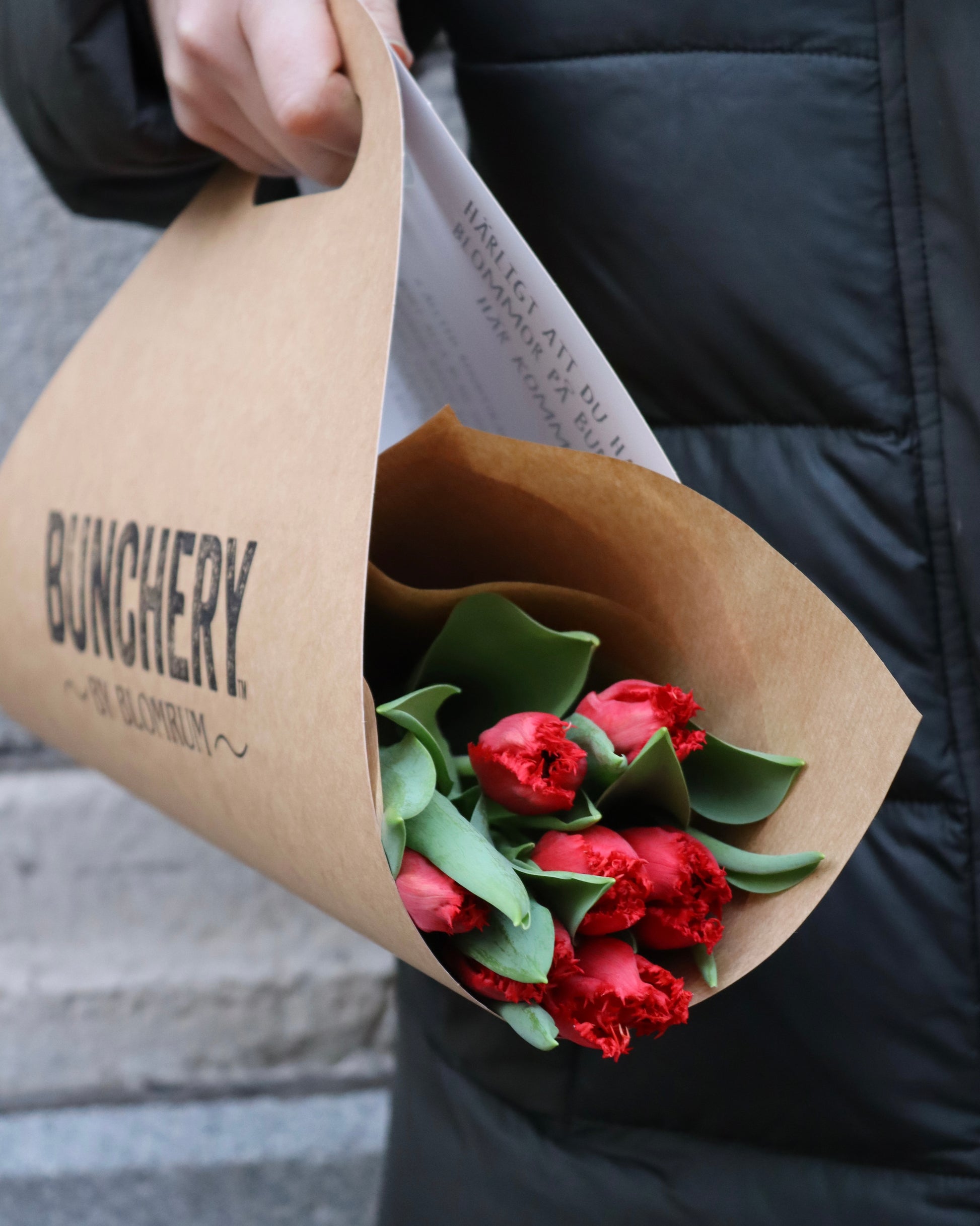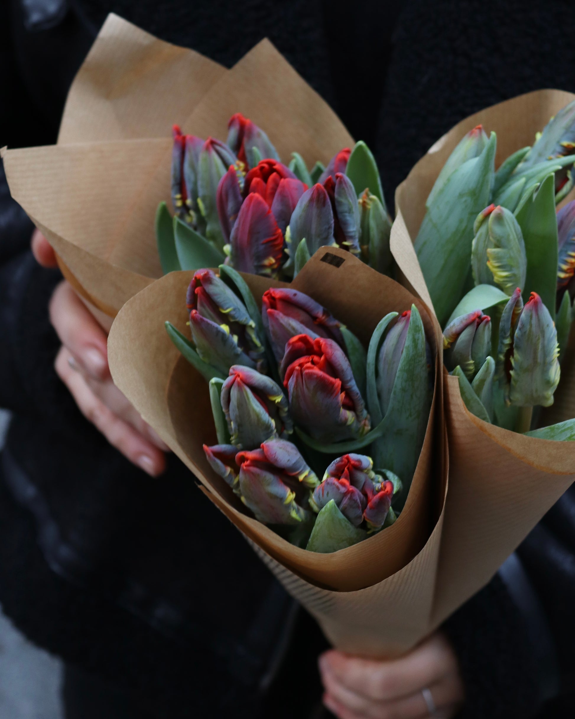 Äntligen är Tulpanerna här! Denna ljuvliga tulpan i röda toner kallas papegoj-tulpan passar fint tillsammans med en bunt waxblomma eller en bunt grönt.